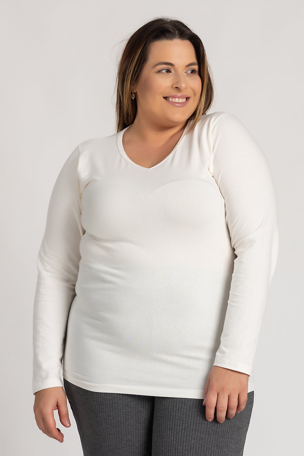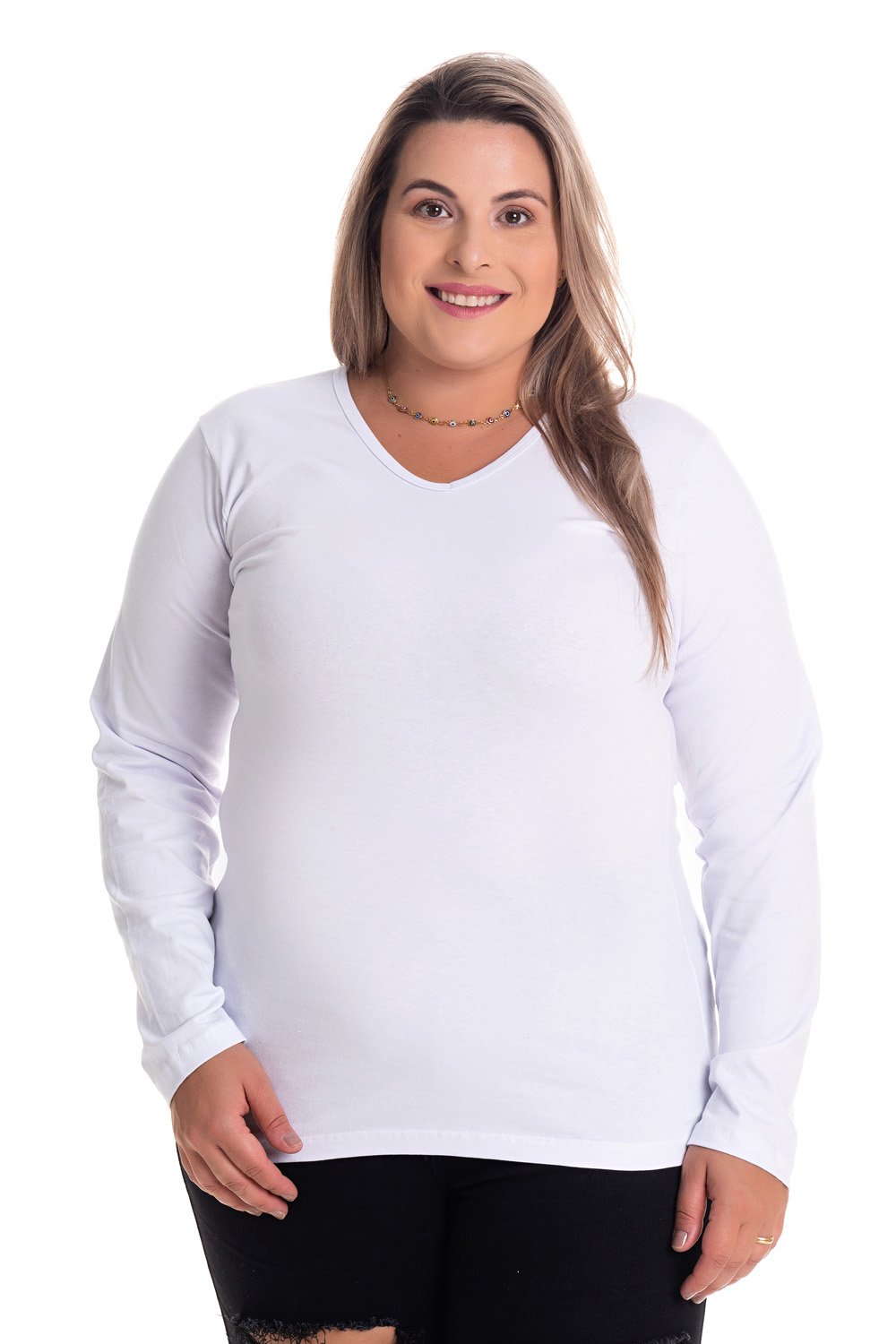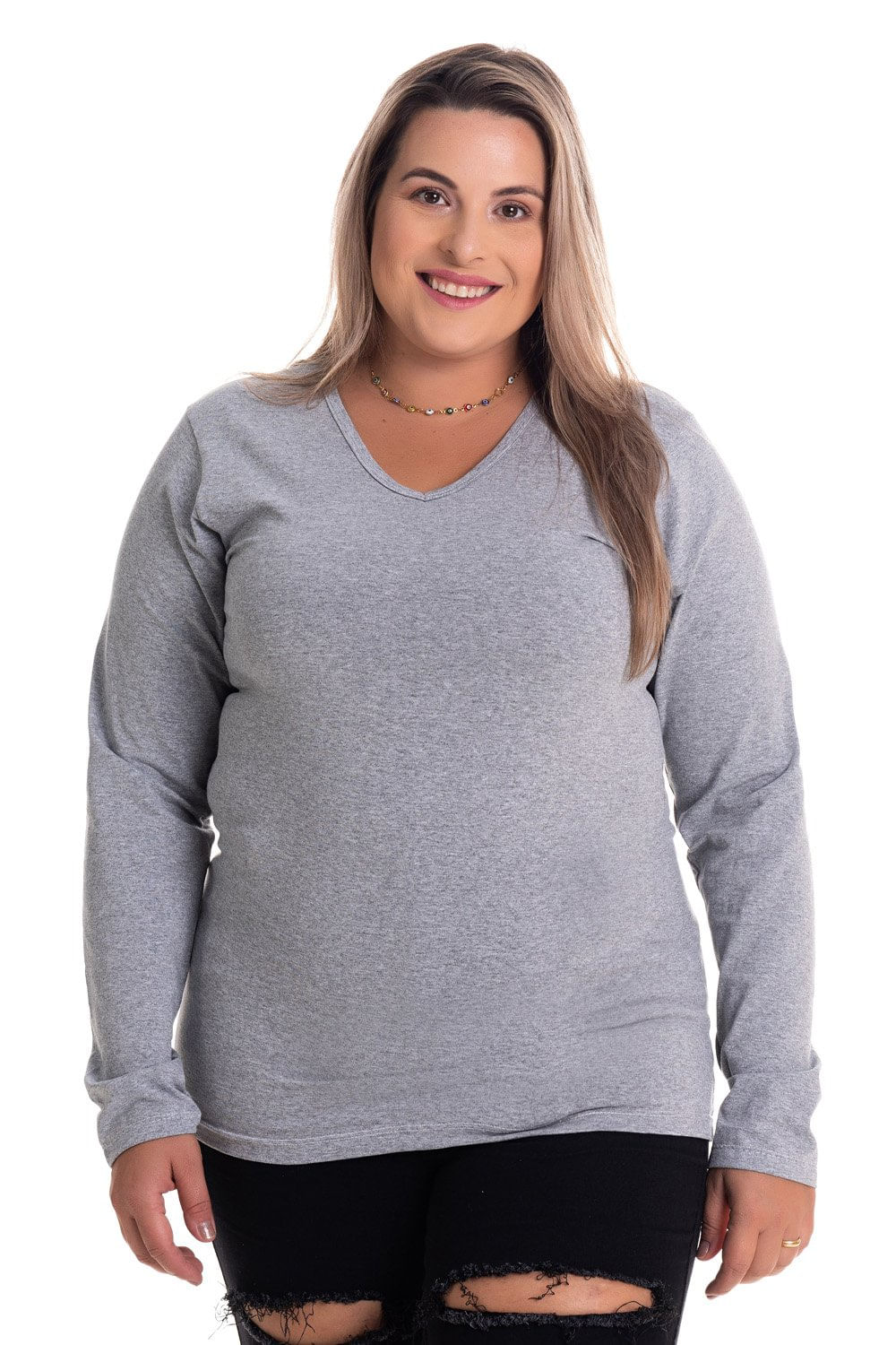 Blusa Feminina Plus Size Manga Longa Cotton Decote 'v' - Serena