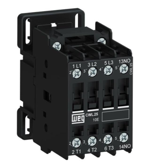 Contator CWL - WEG 25A - Contator CWL - WEG.. CONTATOR..MODELO: CWL..CARACTERÍSTICAS..Desenvolvidos para atender com eficiência e qualidade as funções essenciais para partida e proteção de motores em aplicações específicas, os Contatores CWL possuem a performance na medida exata, com desempenho otimizado e excelente custo-benefício para o seu dia a dia...Aplicações..Construção civil,.Indústria de alimentos,.Indústria têxtil,.Agronegócio....ATENÇÃO!!.-> Ao selecionar a amperagem desejada, fique atento as informações abaixo:..Corrente nominal In - AC-3 (Ue ≤ 440 V) = 9 A 12 A 18 A 25 A 32 A 40 A 45 A.Corrente nominal In - AC-4 = 3,5 A 4,5 A 8 A 9 A 15,6 A 18,5 A 24 A.Corrente nominal de emprego Ie - AC-1 (q = 55 ºC) = 25 A 25 A 25 A 32 A 45 A 50 A 50 A..-> Vida mecânica (CA) 8 milhões.** exceto CWL45, este possui 5 milhões..-> Tipo de terminal: Parafuso..-> Contato principal: 3 NA..Características Gerais do Produto:.. Proteção: Grau de proteção (IEC 60529) - Bobina e contatos auxiliares IP20. Tensão: Tensão de comando 220V 50/60Hz. Isolação: Tensão nominal de isolação Ui (grau de poluição 3) - IEC 60974-4-1 690 V. Tensão de Emprego: Tensão nominal de emprego Ue - IEC 60947-4-1 690 V. Dimensões (mm) / Peso (g): 80 (A) x 45 (L) x 85 (C) / Aproximadamente 300 kg. Máxima frequência de manobra (man./h): Limite mínimo de frequência 25 Hz // Limite máximo de frequência 400 Hz..Acompanha o produto:.. 1 Contator CWL. 1 Manual na caixa..Garantia:.. 3 meses com a loja