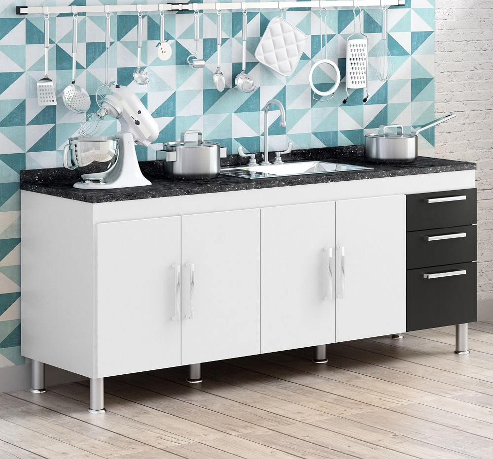 Este gabinete é produzido especialmente para pias de 2m, possui 3 gavetas com corrediças metálicas para melhor armazenar os itens de cozinha e conta com uma prateleira profunda completa no seu interior. Possui puxadores modernos e 5 pés para evitar empenamento da base, o gabinete é totalmente fabricado em MDP de 12mm, aumentando a durabilidade, resistência e qualidade do produto. O gabinete não acompanha o tampo da imagem. Além desses detalhes, possui uma fácil montagem.