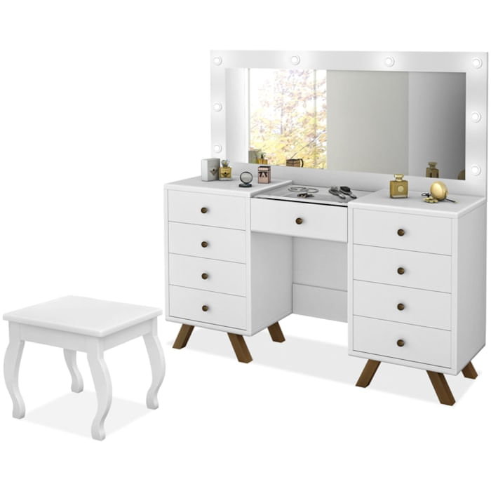 Kit Penteadeira Com Banqueta Em Mdf 00808900x022034, Trata-se De Um Produto Versátil, Que Une Design Moderno E Minimalista À Praticidade No Dia A Dia. Estrutura 100% Mdf De 15 Mm, 18 Mm E 20 Mm, Proporcionando Resistência E Mais Durabilidade À Peça, Contando Com Pintura Em Acabamento Uv Anti Risco. Composto Por Penteadeira Camarim Com Tampos Espaçosos, Perfeitos Para Deixar Seus Itens Preferidos Sempre À Mão, Amplo Espelho De 3 Mm, Iluminado Por 8 Leds Luz Branca, Ideal Para Iluminar O Rosto Na Hora De Se Maquiar, 9 Gavetas Com Corrediças Telescópicas, Proporcionando Ótimo Espaço De Armazenamento Para Seus Objetos, Sendo A Gaveta Central Com Colmeia Para Armazenar Joias E Tampo De Vidro 4 Mm, Para Melhor Visualização De Seus Pertences, Conta Com 9 Puxadores Em Metal Envelhecido, E 8 Pés Em Madeira De Reflorestamento. Banqueta Com Assento Fixo Em Mdf De 15 Mm, E Base Reforçada Com 4 Pés Torneados Em Madeira. Tornando Sua Experiência Na Hora De Se Produzir, Ainda Mais Especial. Este Móvel Chegará Na Sua Casa Separado Em 5 Volumes.