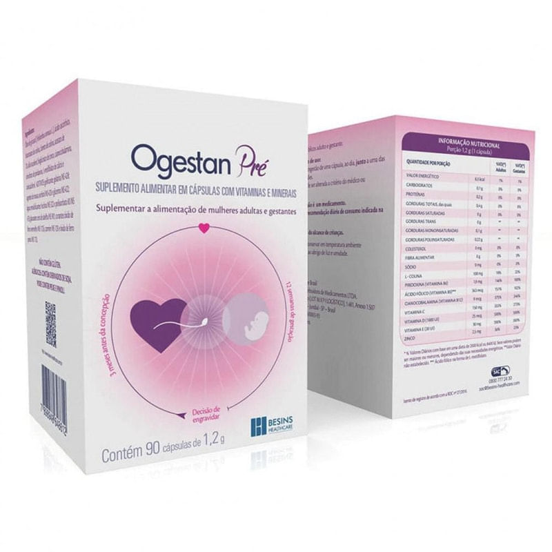 01 unidade..Suplemento Alimentar Ogestan Pré 1,2g com 90 cápsulas.Ogestan.90 Cápsulas.SUPLEMENTO VITAMINICO - MINERAL..Ogestan Pré é um suplemento alimentar em cápsulas para mulheres adultas e gestantes que possui L-metilfolato de cálcio como fonte de ácido fólico e outras vitaminas e minerais...L-metilfolato de Cálcio é fonte de Ácido Fólico. O Ácido Fólico auxilia na formação do tubo neural do feto durante a gravidez. A colina contribui para o metabolismo lipídico e da homocisteína. Ogestan Pré tem alto teor de Vitamina B12 e Vitamina B6 que auxiliam na formação de células vermelhas do sangue e no funcionamento do sistema imune. A Vitamina D, dentre outras funções, auxilia na formação de ossos e dentes e na absorção de cálcio. Ogestan Pré é rico em Vitamina C, um antioxidante que auxilia a absorção de ferro dos alimentos. O Zinco é um antioxidante e auxilia na visão, no funcionamento do sistema imune e na manutenção de ossos...Produto dispensado de obrigatoriedade de registro conforme RDC nº 27/2010 Marca:Besins marca:Besins