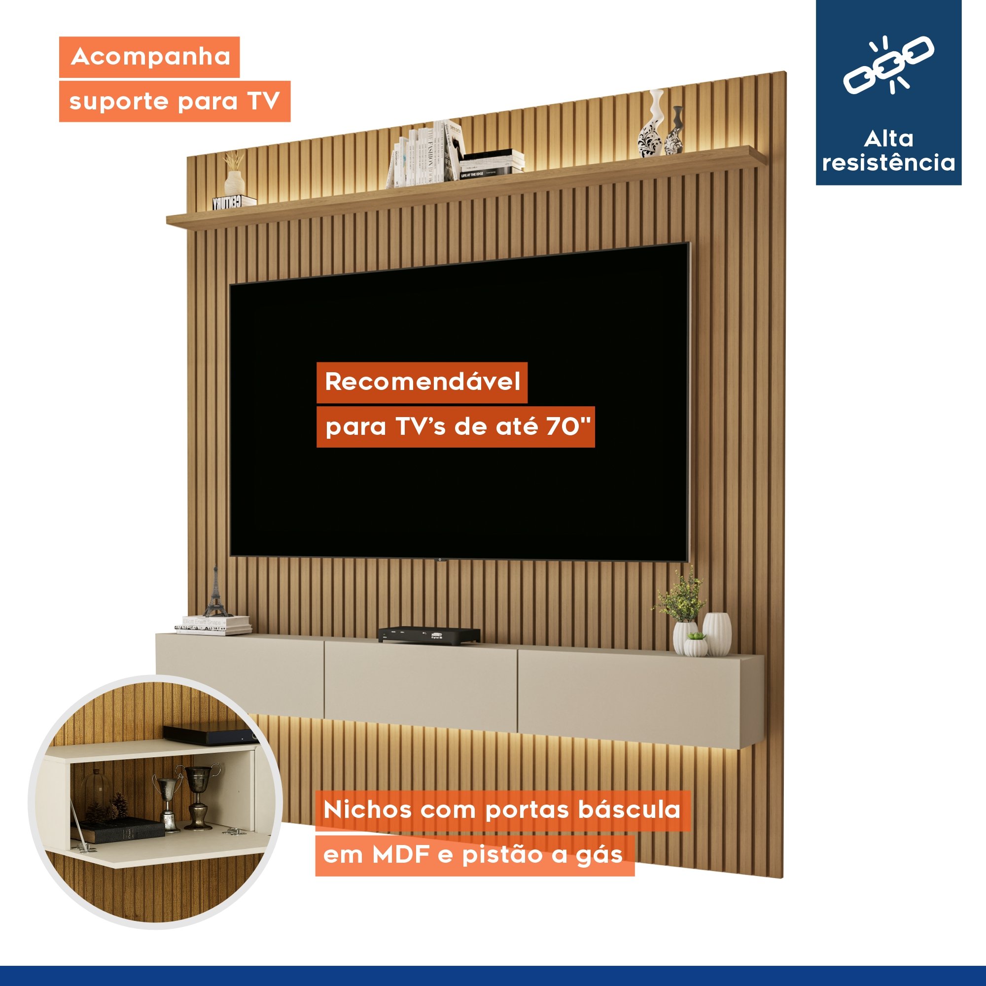 Ele É Uma Ótima Alternativa Para Otimizar Espaço E Agregar Personalidade E Charme Na Decoração. Conta Com 3 Portas Basculantes E Nichos Para Aparelhos Eletrônicos Na Parte Inferior, Também Apresenta Prateleira Superior. Me Diz Se Esse Painel Não É Um Encanto?