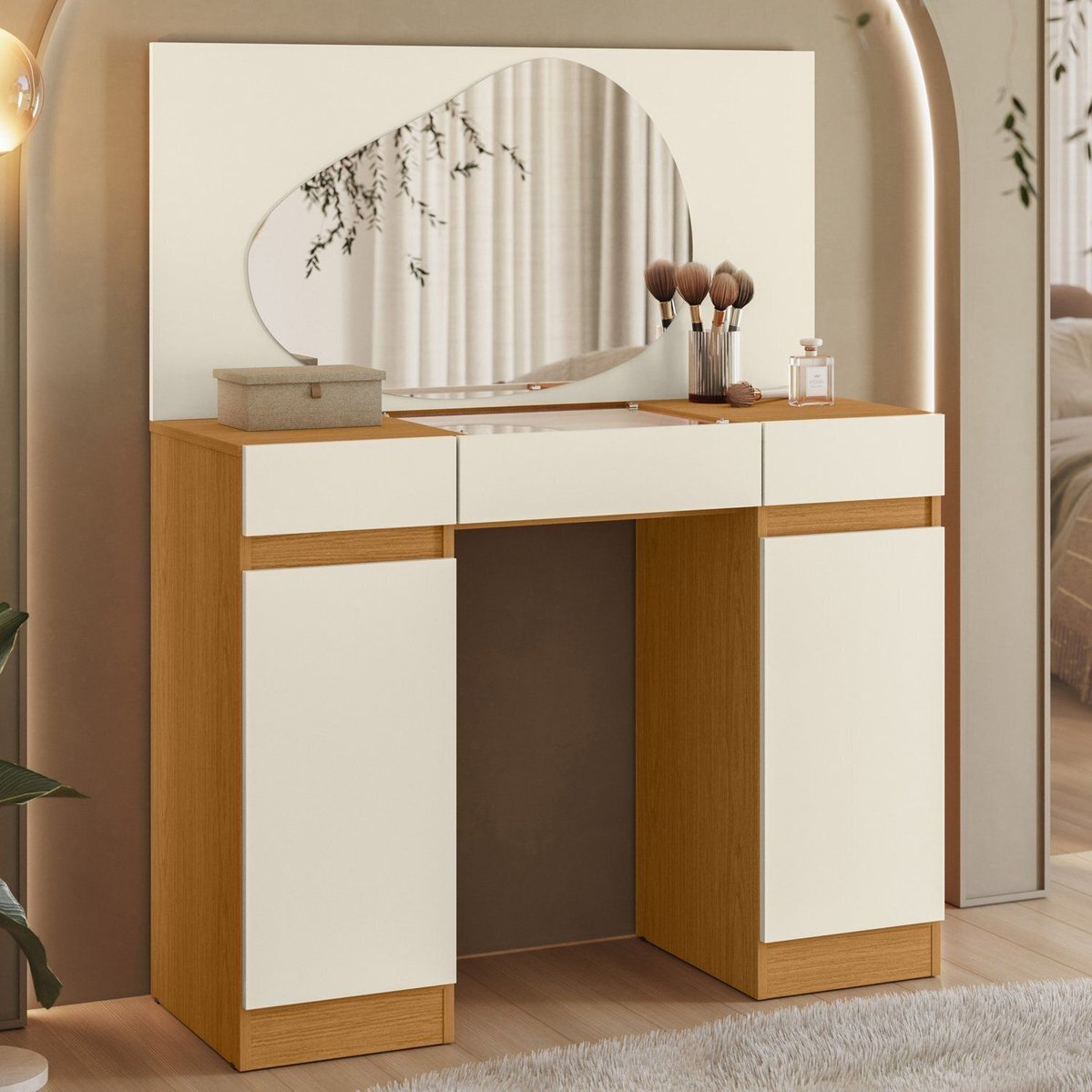 Organize Seu Espaço Com Estilo! A Penteadeira Organic Possui Tampo Com Visor De Vidro (0,40 X 0,36 M), Gaveta Central Com Corrediças Telescópicas E 2 Laterais Com Corrediças Metálicas. Estrutura Em Mdp Com 2 Portas De Bater, 2 Prateleiras Internas E Um Lindo Espelho Orgânico. Funcionalidade E Design Em Um Só Móvel!