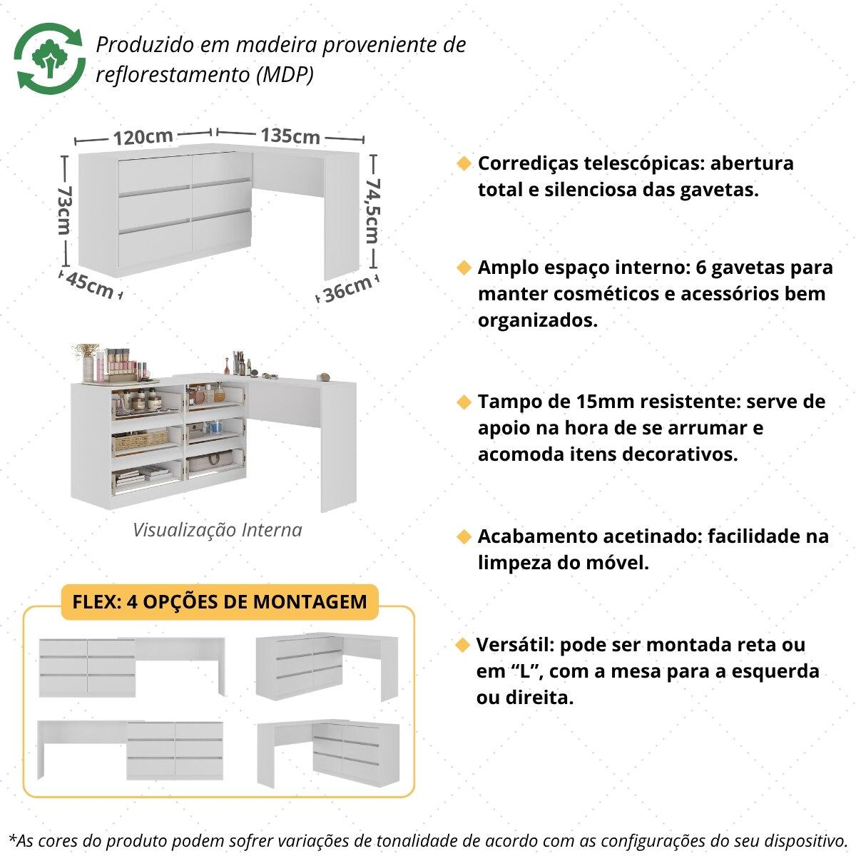 - Penteadeira De Canto 120cm 6 Gavetas Flex Multimóveis Mp4404 Branco