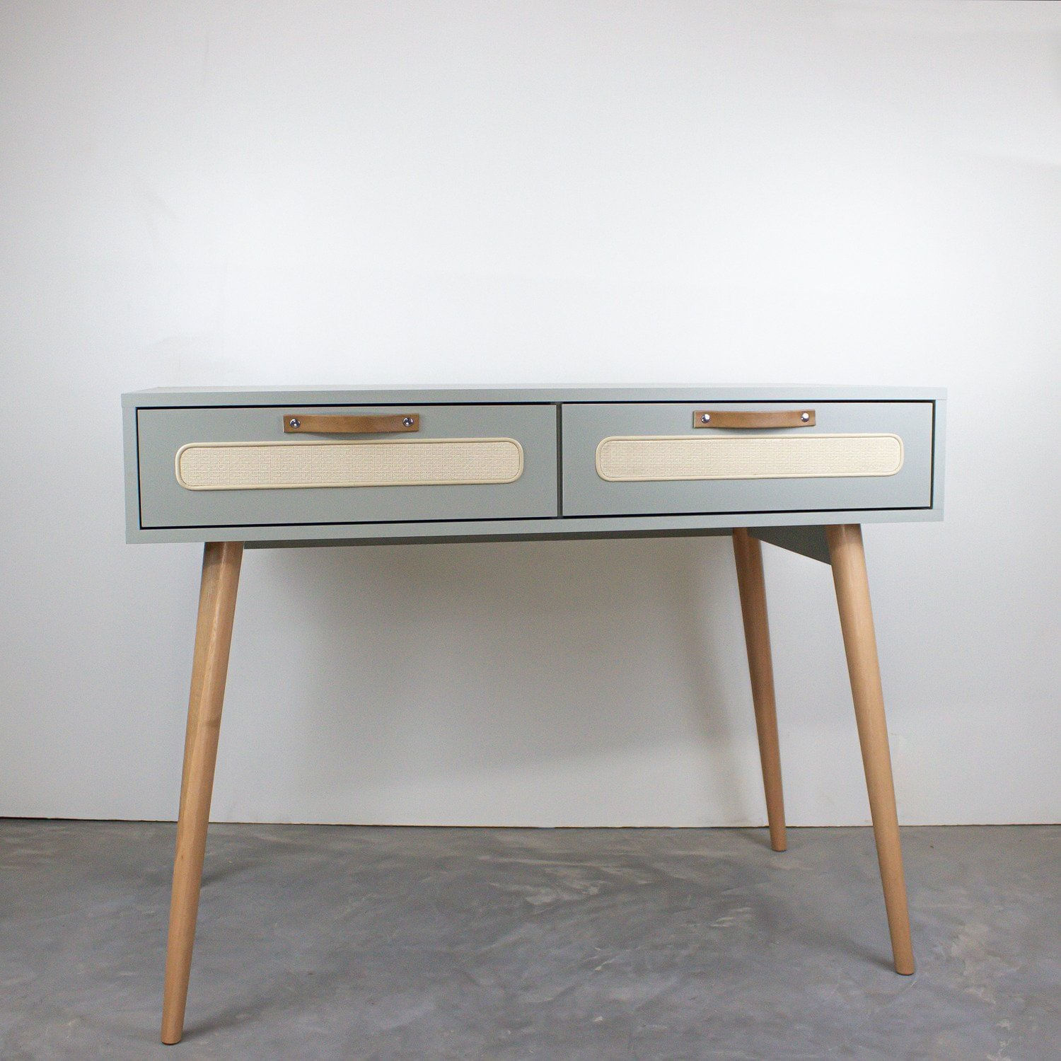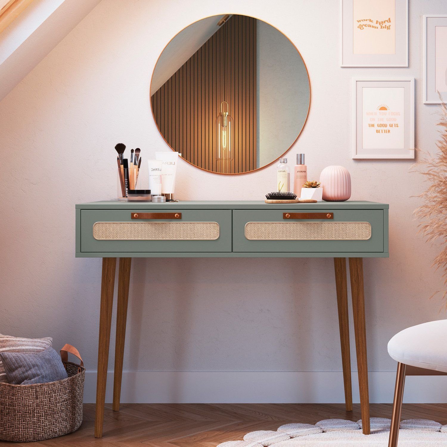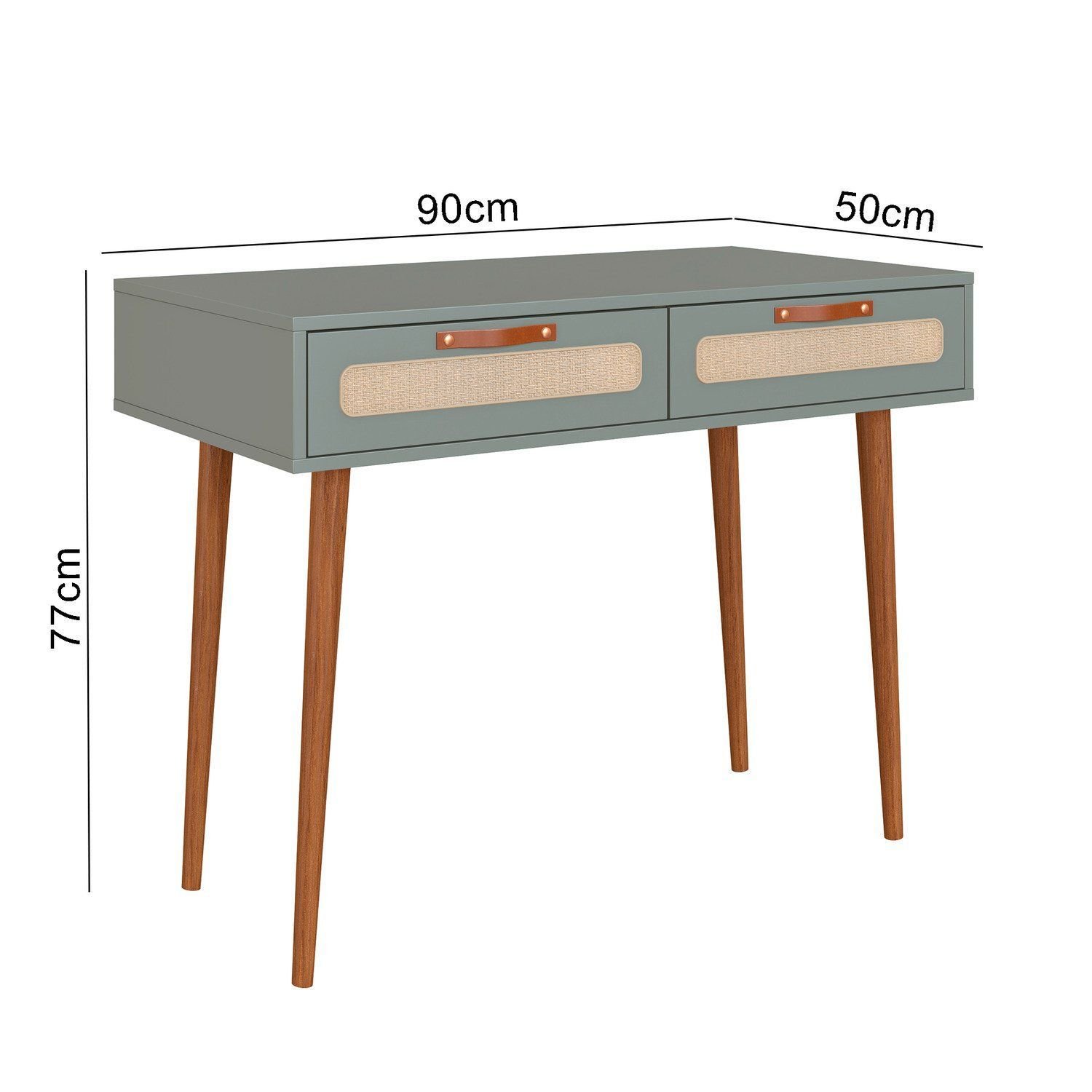 Penteadeira Retrô 90cm, Uma Peça Versátil E Encantadora Para Transformar Seu Espaço. Fabricada Em Mdp Bp 15mm, Seu Design Elegante Destaca-se Pelas Frentes De Gaveta Com Acabamento Em Tela Sustentável, Adicionando Um Toque De Sofisticação Ao Ambiente. O Puxador Em Couro Proporciona Um Charme Adicional, Enquanto Os Pés Em Madeira Natural Garantem Estabilidade E Um Toque De Autenticidade. Esta Penteadeira Não É Apenas Um Móvel Bonito, Mas Também Versátil, Podendo Ser Utilizada Como Penteadeira Para Seus Rituais De Beleza, Aparador Para A Sala Ou Até Mesmo Como Uma Mesa De Escritório Estilosa. Com 100cm De Comprimento, Oferece Espaço Compacto Sem Comprometer A Funcionalidade.