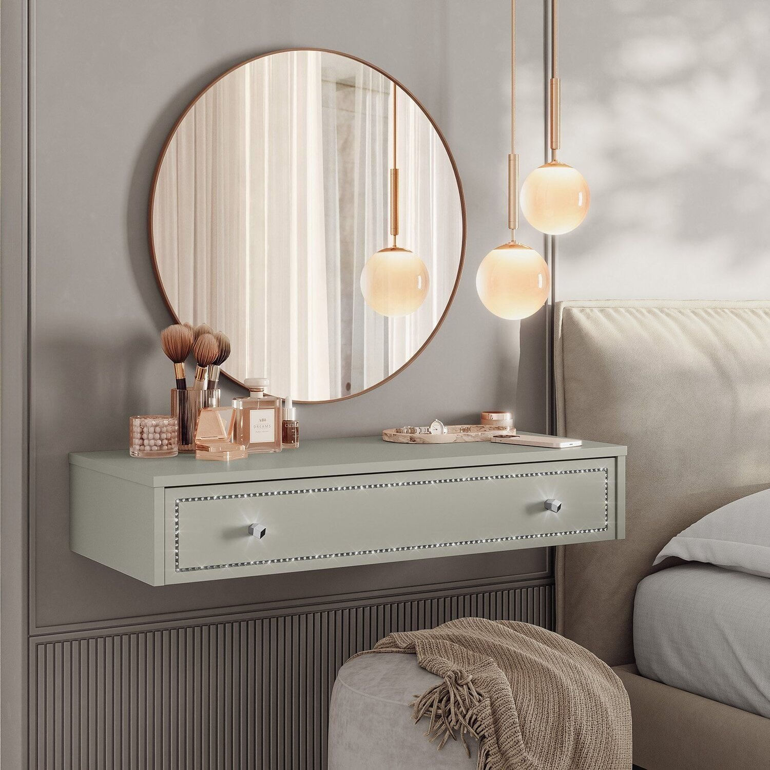 A Penteadeira Suspensa Strass É Um Produto Com Um Design Moderno, Inspirado No Estilo Italiano Com Um Toque Romântico E Sofisticado. Possui Um Detalhe Na Gaveta Com Um Friso Preenchido Com Uma Corrente De Pedras Em Strass Dando Um Brilho Intenso, Os Puxadores São Na Forma Hexagonal Refletindo O Seu Brilho Na Peça. Ela É Suspensa Na Parede Economizando Espaço E Ampliando Seu Ambiente. Possui Uma Gaveta Com Corrediças Telescópicas E Nela Contém Uma Colmeia Para Você Rechear Com Maquiagens, Acessórios E Produtos Para Beleza. Este Produto Mostra Ao Mesmo Tempo Sofisticação, Delicadeza E Uma Elegância Luxuosa Para O Seu Ambiente.