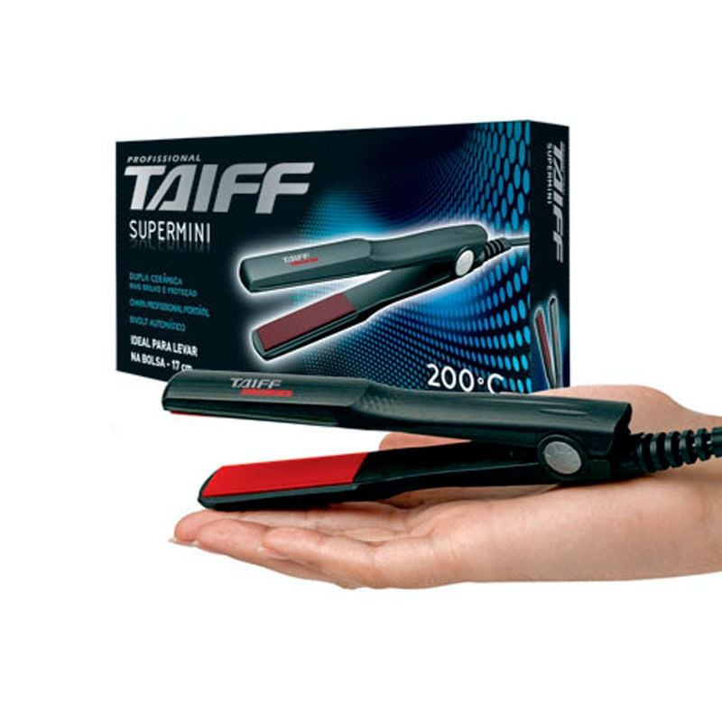 Prancha Chapinha de Cabelo Super Mini Taiff Bivolt.. .Código de barras: 7896116107640.Código NCM: 85163200.Peso: 0,165 kg.Tamanho: 20 x 10 x 10.Marca: Taiff. .Descrição do Produto.Chapinha / Prancha Alisadora Super Mini Taiff Bivolt. .Modelo.SUPER MINI. .Temperatura de Trabalho.200° C. .Aquecimento Cerâmico PTC.Mantém a temperatura constante. .Dupla Cerâmica.Sim. .Comprimento do Cabo.1,8 m. .Voltagem.Bivolt automático. .Peso Líquido Aproximado.0,165 Kg.Selo INMETRO OCP 0005