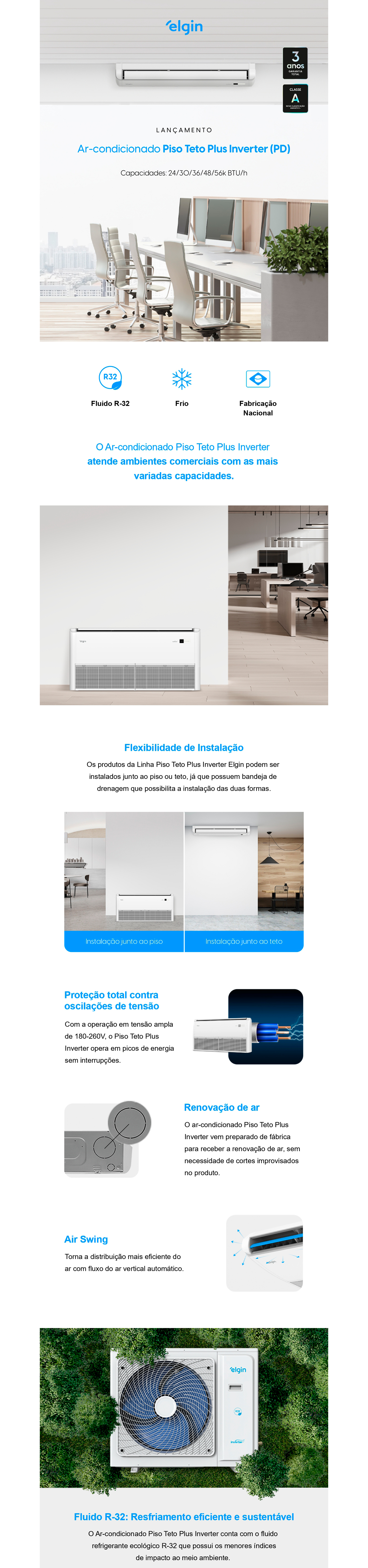 a Linha Piso Teto Plus Inverter Da Elgin Tem Um Design Elegante Capaz De Refrigerar Diversos Ambientes De Médio A Grande Porte, Proporcionando Conforto Térmico E Deixando O Dia A Dia Muito Mais Agradável E Refrescante.