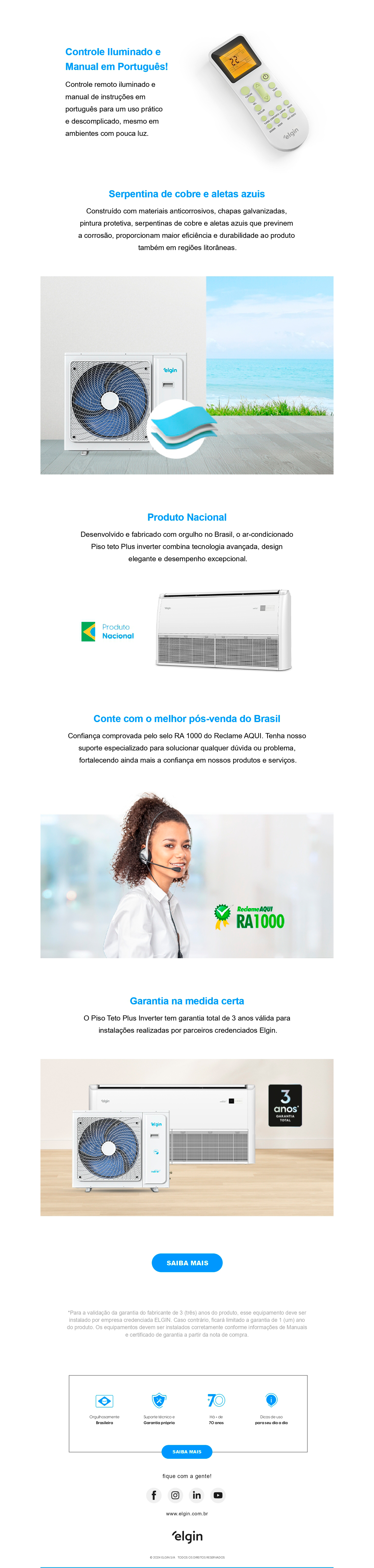 garantia Na Medida Certa: O Piso Teto Plus Inverter Tem Garantia Total De 3 Anos Válida Para Instalações Realizadas Por Parceiros Credenciados Elgin *observação Sobre Garantia: Para A Validação Da Garantia Do Fabricante De 3 Anos Do Produto, Esse Equipamento Deve Ser Instalado Por Empresa