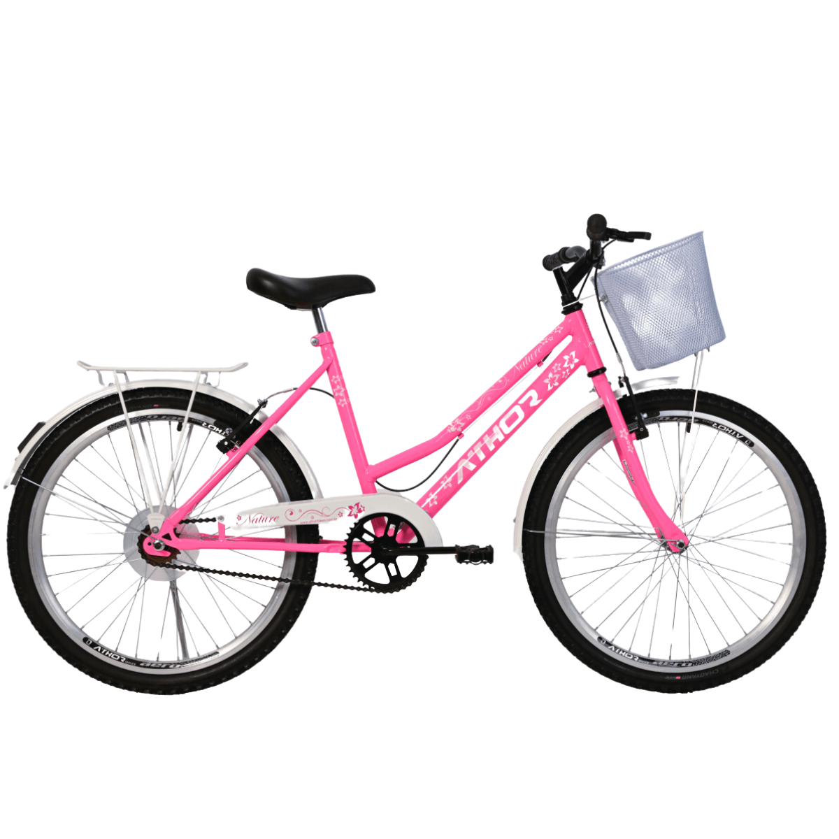 Bicicleta  Aro 24 Infantil Feminino Athor Nature Com Cesto   Para As Meninas Que Buscam Conforto E Qualidade E Não Abrem Mão De Muito Estilo. A Nature É Uma Bike Completa, Equipada Com Cestão, Bagageiro, Para-lamas, Cobre Corrente E O Design Que Chama A Atenção Por Onde Passa.   Especificações:   - Quadro   Aço Carbono   - Garfo   Aço Carbono   - Canote Selim   250mm   - Guidão   Downhill   - Suporte Guidão   21mm   - Pneu   24”x1.75   - Aro   24” Aero   - Cubo   36 Furos Em Aço   - Freio   V-brake Nylon   - Corrente   Aço Grossa   - Pedal   Nylon   - Cesta   Aramada   - Bagageiro   Aramado