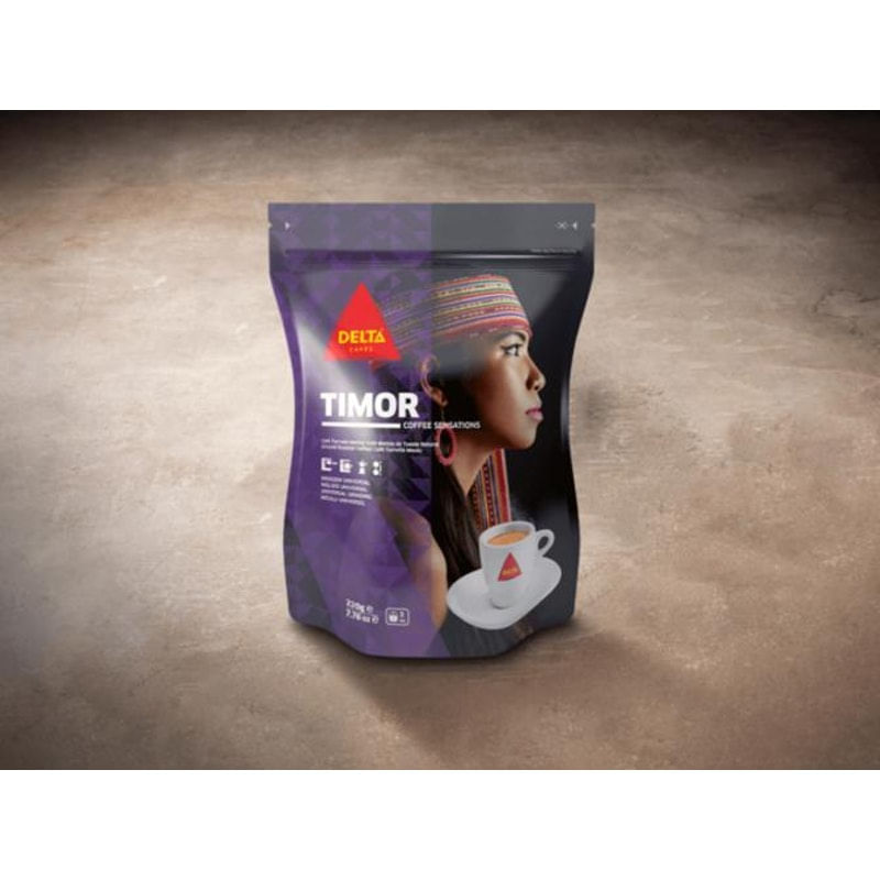 Café Delta Timor..Um blend harmonioso, composto por um dos mais afamados cafés do mundo, dá origem a uma bebida exótica, com traços doces de chocolate e especiarias, perfumada com a alegria deste povo...Especificações Técnicas .Marca: Delta Cafés .Linha: Origens - Coffee Sensations .Tipo: Torrado e moído .Peso total: 250g ..Sobre a Delta Cafés .Fundada em 1961 por Rui Nabeiro, a Delta Cafés conquistou há mais de 50 anos a preferência dos portugueses. Especializada na torra e comercialização de café, é líder no mercado português e exporta para dezenas de países.