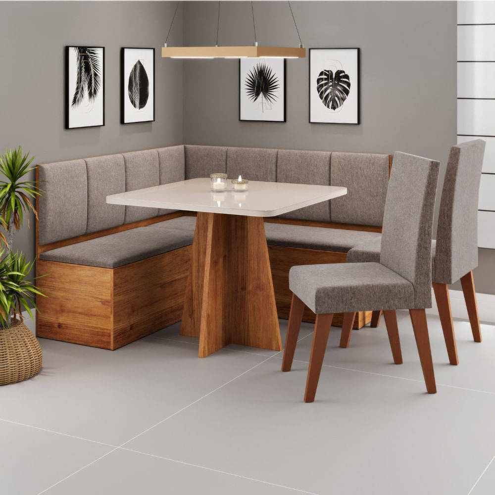 O Conjunto Canto Baú Syrah Com Vidro Reúne Praticidade E Sofisticação Em Um Único Produto. Seu Formato Articulado Funciona Como Divisor De Ambientes, Acomodando De 3 A 5 Pessoas Com Conforto E Versatilidade. A Mesa Tem Base Em Mdp E Tampo De Mdf 18 Mm, Protegido Por Vidro Colado De 4 Mm Que Confere Maior Durabilidade E Aparência Refinada. Os Cantos Arredondados Garantem Segurança Extra No Uso Diário. As Cadeiras, Feitas Em Madeira De Eucalipto De Alta Qualidade, Oferecem Firmeza E Longa Vida Útil. O Estofado Em Tecido Linho Adiciona Um Toque Acolhedor E Elegante Ao Conjunto. O Baú Integrado Proporciona Espaço Extra Para Guardar Utensílios Ou Objetos Do Cotidiano, Ajudando A Manter O Ambiente Sempre Organizado. Versátil, Adapta-se Com Facilidade A Cozinhas, Salas De Jantar, Áreas Gourmet E Outros Espaços. Um Conjunto Completo, Charmoso E Funcional Para Valorizar Sua Decoração.