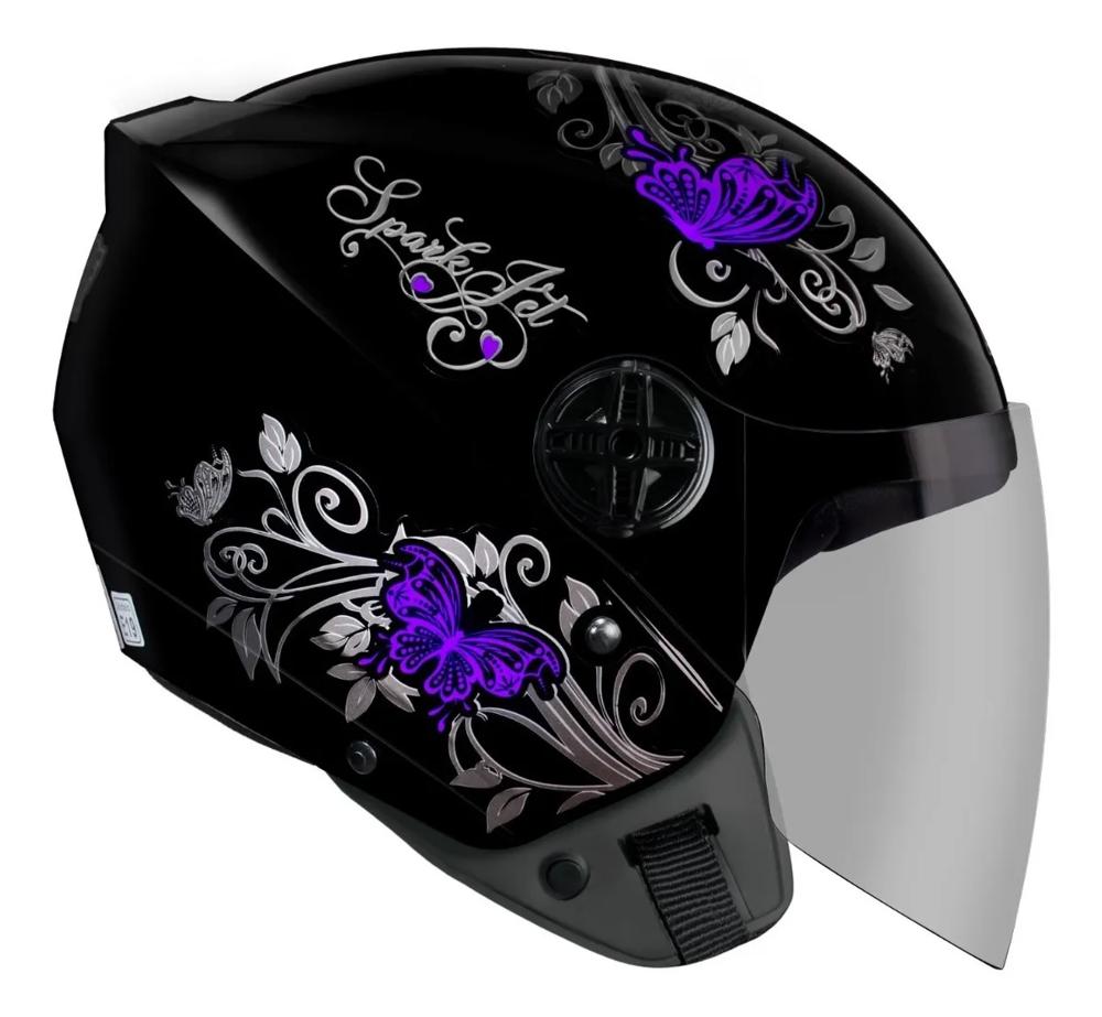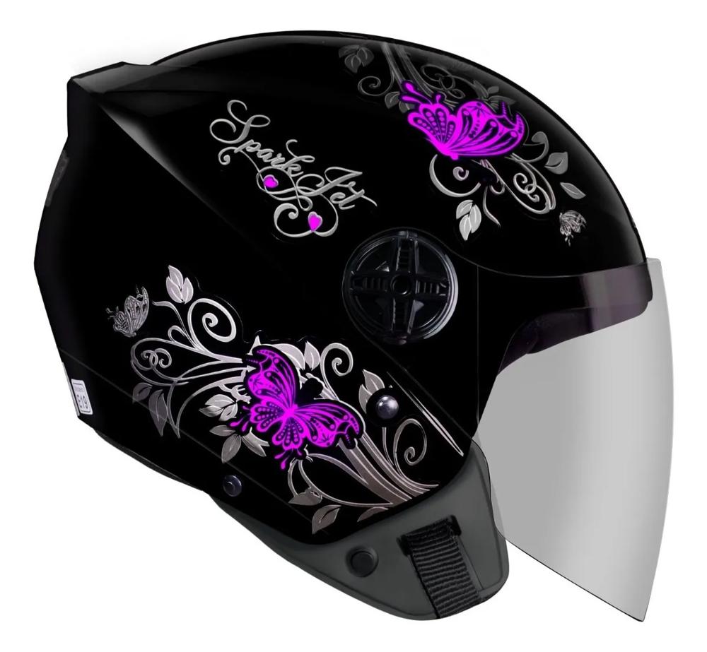 Capacete Aberto Ebf Spark Jet Borboleta Design Moderno, Com Inspiração Italiana, De Excelente Aerodinâmica. O Capacete Spark Jet É Um Modelo Aberto, Econômico E De Ótima Qualidade. Capacete Leve E Seguro. Garanta O Melhor Com A Qualidade De Um Produto Original Ebf. Características: - Capacete Modelo Aberto - Casco Confeccionado Em Abs De Alto Impacto - Viseira Em Policarbonato Com Espessura De 2mm - Cinta Jugular Com Fecho De Engate Rápido - 3 Meses De Garantia De Fábrica - Alta Qualidade E Resistência - Selo Inmetro Selecione A Cor E O Tamanho Desejado Antes De Efetuar A Compra: - Cores: Preto E Rosa, Preto E Lilás - Tamanhos: 56, 58, 60 Produto Original Ebf