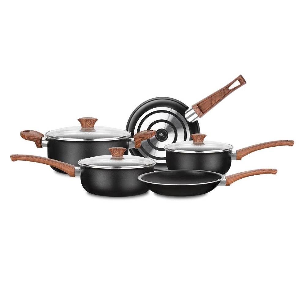 Estrutura Em Alumínio, Livre De Pfoa, Tampas De Vidro Temperado Com Saída Para Vapor, Espessura Superior 2,0mm, Cabos E Alças Revestidos Com Soft-touch Amadeirado, Cozimento Rápido E Uniforme, Revestimento Antiaderente Com Particulas Cerâmica, Não Compatível Em Fogões De Indução