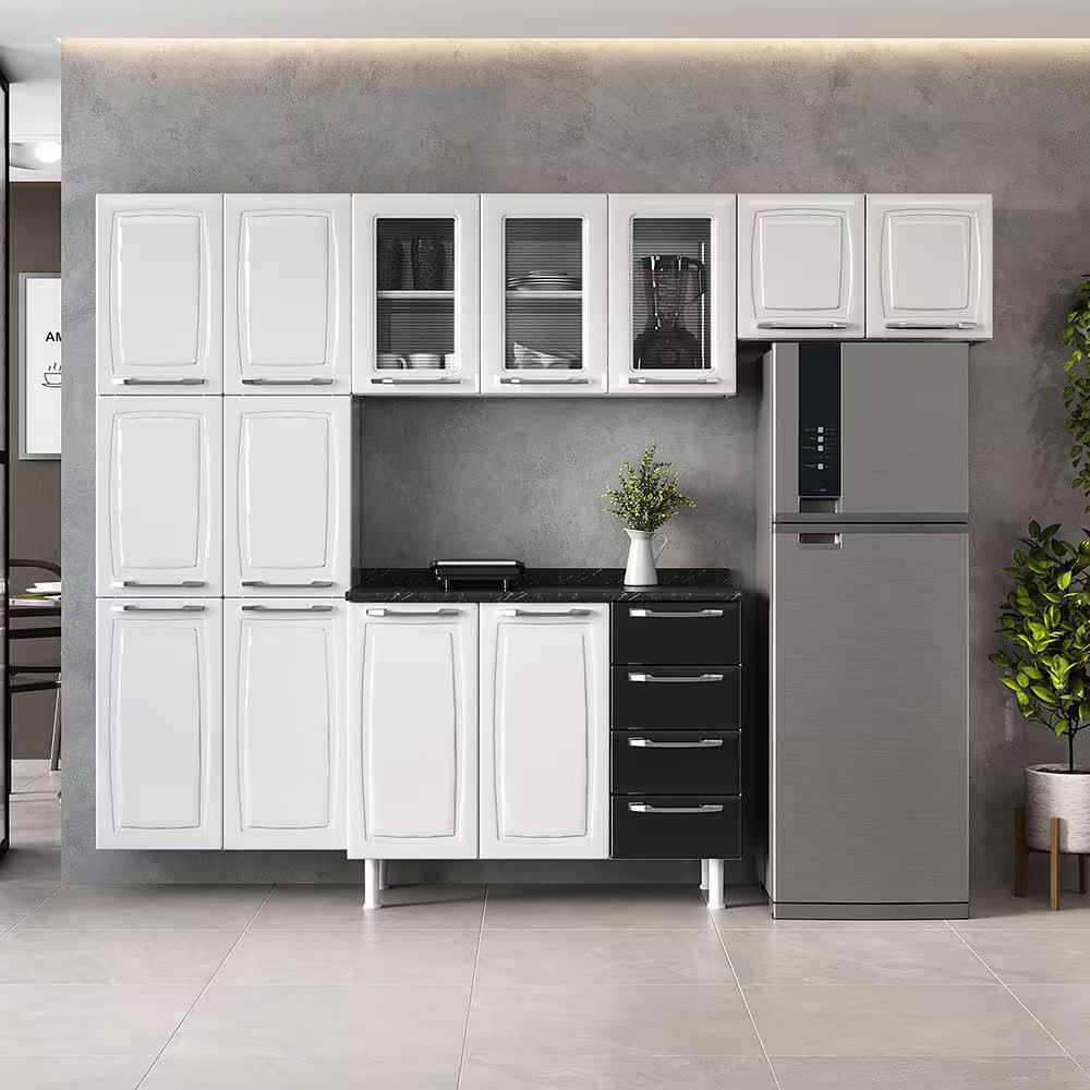- Detalhes: Prateleiras internas para melhor distribuição de espaço, gavetas com corrediças metálicas que deslizam suavemente, além de espaçosos nichos, balcão espaçoso e uma coloração incrível.
