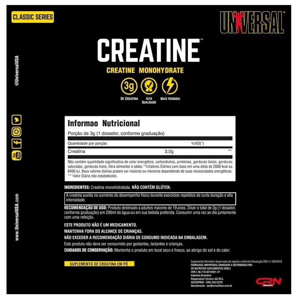 Características Do Produtocreatina Universal É Um Suplemento Alimentar À Base De Creatina Monohidratada E Micronizada Fabricada Pela Consagrada Marca Americana Universal Nutrition. Amplamente Conhecida E Mundialmente Utilizada, A Creatina Universal Destaca-se Também Pelo Selo De Qualidade Creapure, Uma Creatina De Origem Alemã Produzida Com Avançados Processos Tecnológicos Que Garantem Um Elevado Grau De Pureza E Alta Taxa De Absorção.
