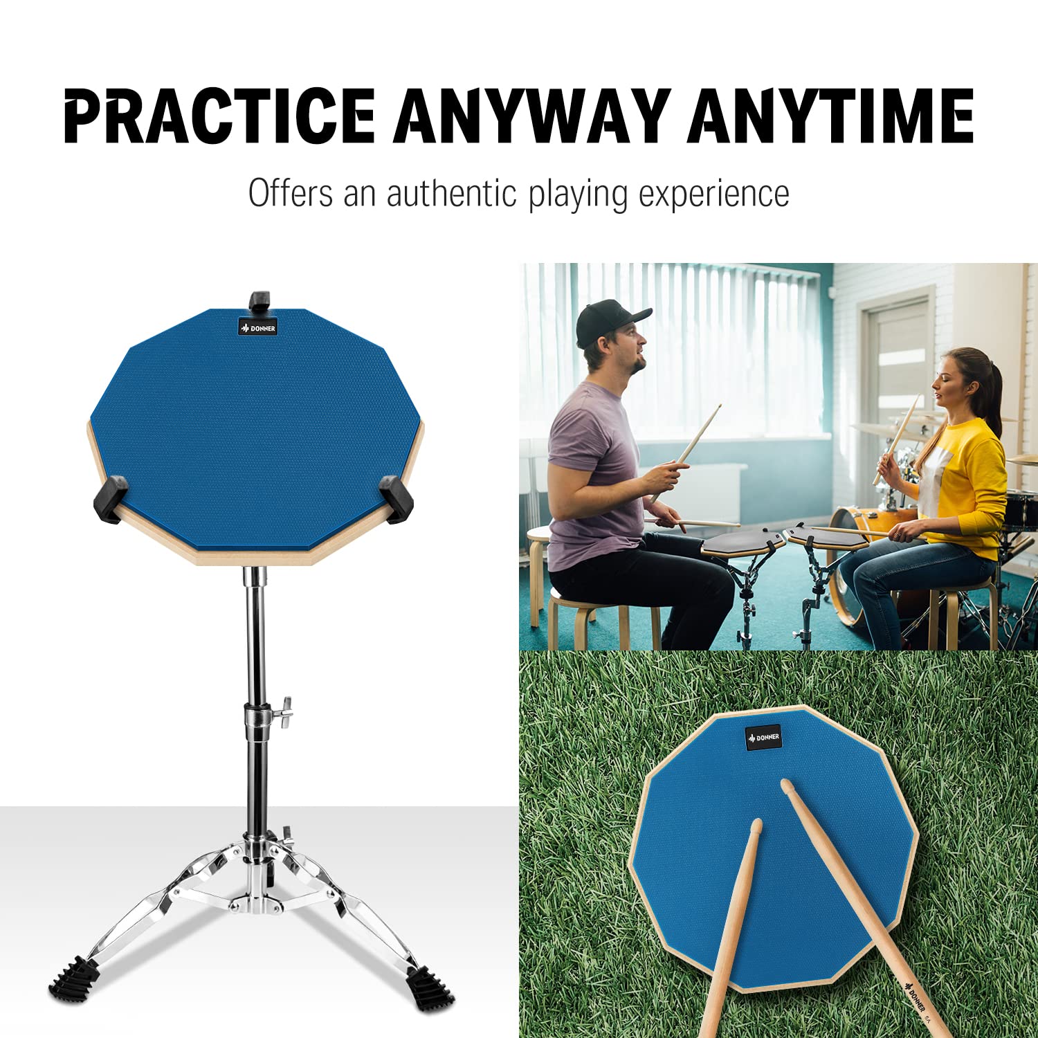 Drum Practice Pad Donner De 12 Polegadas Silent Blue Com Baquetas