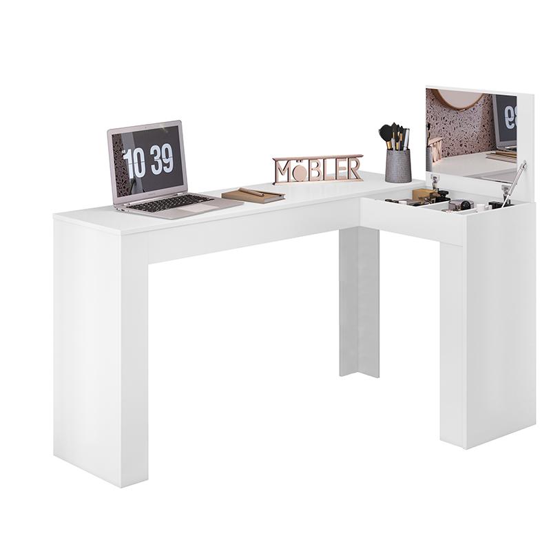 Modelo: Escrivaninha De Canto Com Penteadeira Jade, Largura Maior: 135,5 Cm, Largura Menor: 82 Cm, Profundidade: 36,5 Cm, Altura: 75,5 Cm Altura Aberto: 109,5 Cm, Material Da Estrutura: Mdp Com Tampo Basculante De Pistão A Gás E Nicho Organizador Interno, Espelho De 40x30x03 Cm, Em Forma De L: Sim, É Gamer: Não, Quantidade De Portas: Não Se Aplica, Tipo De Dobradiças: Não Se Aplica, Quantidade De Gavetas: 01, Tipo De Corrediças: Telescópica, Com Puxador: Não Se Aplica, Com Fechadura: Não, Inclui Chaves: Não Se Aplica, Quantidade Prateleiras: 01, Quantidade De Nichos: 04, Possui Suporte Para Teclado: Não, Com Rodízios: Não, Peso Suportado: Até 30 Kg Distribuídos, Requer Montagem: Sim (kit Montagem Incluso), Condição Do Item: Novo, Embalagem Do Envio: Papelão E Plástico, Informações Adicionais: - Os Objetos Que Ambientam As Fotos Não Acompanham O Produto, - O Produto Será Entregue Desmontado, - É De Inteira Responsabilidade Do Cliente A Montagem Do Produto E/ou Instalação, Custos De Transporte Por Escadas E/ou Elevadores, Guincho Ou Içamento, Assim Como Possíveis Irregularidades Provenientes De Manuseio Inadequado, - Embora O Produto Acompanhe O Manual De Montagem, Verifique A Complexidade Antes De Decidir Montá-lo Sozinho, Recomendamos Que Contrate Um Profissional De Sua Confiança, - Fique Atento, Nossas Cores Podem Sofrer Alterações Dependendo Do Seu Monitor, - Antes De Montar O Seu Produto, Certifique-se Que Todas As Instruções Dispostas No Manual, Bem Como Todas As Ferragens Descritas, Estejam Presentes Dentro Da Embalagem. Verifique Se Há Alguma Peça Danificada, Caso Esteja, Prestaremos A Devida Assistência Dentro Do Prazo Da Garantia.