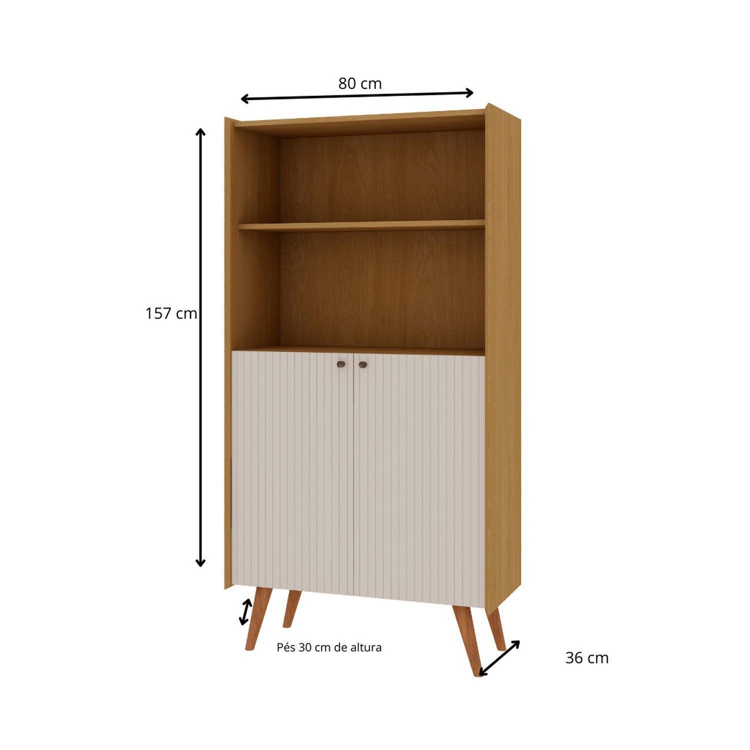 Estante Livreiro Com Molduras Detalhes Em 45° 100% Mdf E 2 Portas Pés Em Madeira Maciça Cinamomo/white.