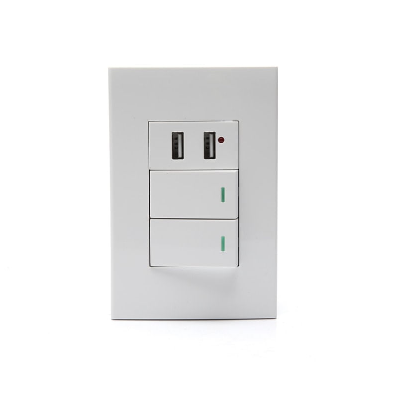 Interruptor Duplo E 2 Portas USB Celular Adaptador Parede..Após a instalação que é feita da mesma forma de uma Tomada convencional, basta plugar o cabo USB em seu aparelho eletrônico e a outra ponta no nosso produto e começará automaticamente a carregar seu dispositivo..Produto desenvolvido para substituir sua a tomada de parede convencional e lhe proporcionar praticidade e tecnologia na hora do carregamento de seus aparelhos eletrônicos..Fabricada com os melhores carregadores e componentes elétricos existentes no mercado, ainda composta com proteção contra curto circuito, protegendo seus aparelhos de sobrecargas entre outros problemas elétricos existentes nas redes elétricas..(OBS) Recomendamos que a instalação seja feita por um técnico... INFORMAÇÕES TÉCNICAS .. Tensão de Entrada: 110V . Frequência: 50/60Hz,. Corrente Nominal: 10A,. Tensão de Saída USB: 5V . Compatibilidade: Qualquer Aparelho USB,. Instalação: Evite Locais que Tenha Umidade,. Possui 2 interruptores,. Possui 2 Portas USB,. Cor: Branco . Dimensões (Produto):120x80mm/4.73x3.15. Peso (Embalagem): 110g..Itens Incluso:.1x Interruptor Duplo Com 2 Entradas usb