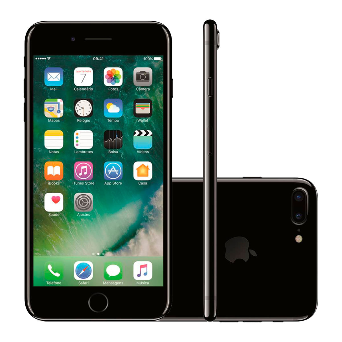 Com uma experiência ainda mais aprimorada, o iPhone 7 Plus está ainda mais completo. Suas câmeras estão mais potentes e a bateria ganhou um desempenho superior, sendo a melhor que a Apple já produziu. Outra novidade é que este é o primeiro iPhone resistente a respingos d¿água, ou seja, não precisa mais se preocupar daquele jeito quando molhar. A cor preto brilhante deixa o iPhone 7 Plus ainda mais bonito e sofisticado. Destaque para sua tela incrível de 5.5 polegadas.