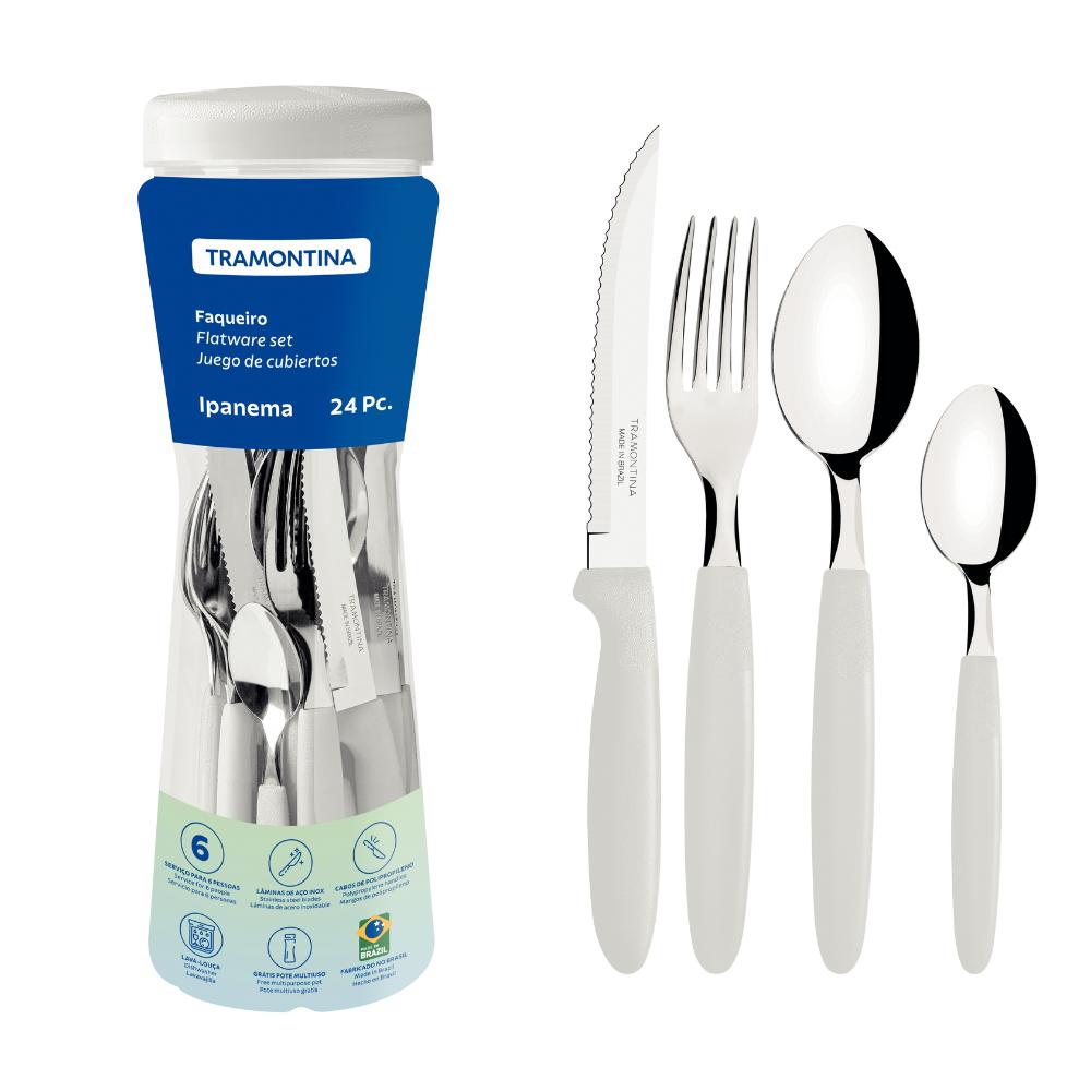 Jogo De Talher Faqueiro Ipanema Aço Inox 24 Peças Tramontinacom O Faqueiro Tramontina Ipanema Com Lâminas Em Aço Inox E Cabos De Polipropileno Com Pote Plástico 24 Peças, Você Irá Deixar Suas Refeições Ainda Mais Saborosas E Cheias De Estilo! Ele Tem Peças Produzidas Com Lâminas Resistentes E Duráveis Em Aço Inox E Cabos Em Polipropileno Que Proporcionam Um Manuseio Confortável E Suave. Ele Vem Na Cor Verde Esmeralda E Vai Levar Muito Mais Cor Para Sua Mesa, Deixando Sua Mesa Muito Mais Agradável. Além Disso, Suas Peças São Muito Fáceis De Limpar E Podem Ir À Máquina De Lavar Louças Diariamente. O Faqueiro Acompanha Também Um Pote Plástico Que Lhe Auxilia Na Hora De Guardar E Armazenar Suas Peças Ou Alimentos!descrição O Produtomarca: Tramontinalinha: Ipanemaserviço 6 Pessoascolher De Mesa Ipanema: 6colher Para Chá Ipanema: 6faca Para Churrasco 5" Ipanema: 6garfo De Mesa Ipanema: 6imagens Meramente Ilustrativas, Todos Os Itens Que Ambientam O Produto Não Estão Inclusos.