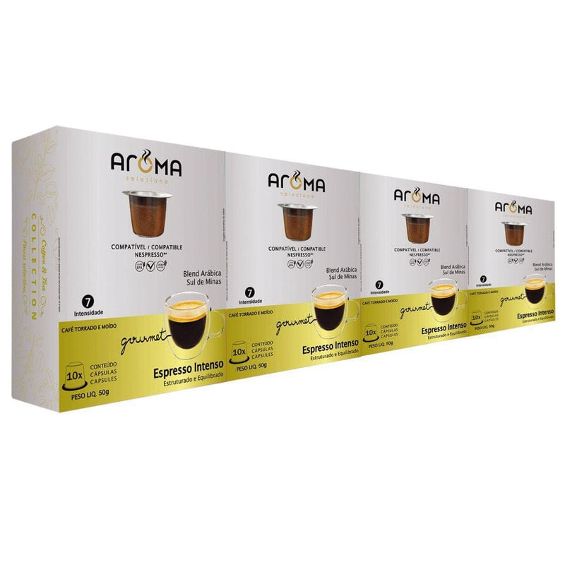 Por que as cápsulas da Aroma..- 100 % compatível com Nespresso®.- Ingredientes das melhores origens do mundo.- Café espresso profissional a qualquer hora.- Cápsulas recicláveis e livres de BPA.- Produto presente nos melhores mercados e lojas do Brasil..Conteúdo do Kit.- 15 Caixas de 10 cápsulas para Nespresso. Totalizando 150 cápsulas para Nespresso. ..Sabores e quantidades do Kit.- 15 Caixas de Espresso Intenso..Compatível com Nespresso e Oster.- Nossas cápsulas funcionam perfeitamente em todos os modelos de máquinas da Nespresso. 100% compatível. Sua máquina estará em perfeito estado sempre. .- São compatíveis com os seguintes modelos: Inissia, Pixie, U, Essenza DeLonghi, Essenza Mini, Prodigio, Citz, Oster Primalatte, Lattisima One, Lattisima Touch, Maestria, Concept e Expert...Escolha de Sabores.- Infelizmente não é possível a escolha de sabores. São kits fechados, prontos para envio. Você encontra a relação de sabores inclusos no kit, nas imagens e na descrição escrita do anúncio...Envio do pedido.- Assim que o pagamento for confirmado, seu pedido será postado no prazo máximo de 24 horas úteis...Sabores dos Cafés inclusos no Kit.- Espresso Intenso (Intensidade 7).A qualidade consagrada do Espresso Intenso é uma bebida que corresponde a todas as exigências de um consumidor seleto, apreciador de um café de alta qualidade com aroma intenso e sabor suave. Sem açúcar. Dose: 40ml...Detalhes do Kit.- Marca: Aroma Selezione.- Validade: 1 ano.- Condições de armazenamento: Conservar em local fresco e seco.- Fabricado no Brasil