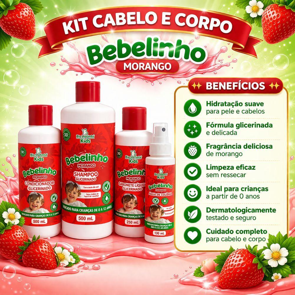 Transforme o momento do banho em uma experiência divertida e feliz com o Kit Cabelo e Corpo Bebelinho Morango Bio Instinto Kids. Foi desenvolvido especialmente para o cuidado completo das crianças, unindo limpeza suave, hidratação e uma fragrância deliciosa que transforma o banho em um momento ainda mais especial, com fórmula glicerinada e delicada, é ideal para o uso diário, proporcionando cuidado sem agredir a pele e os cabelos dos pequenos.