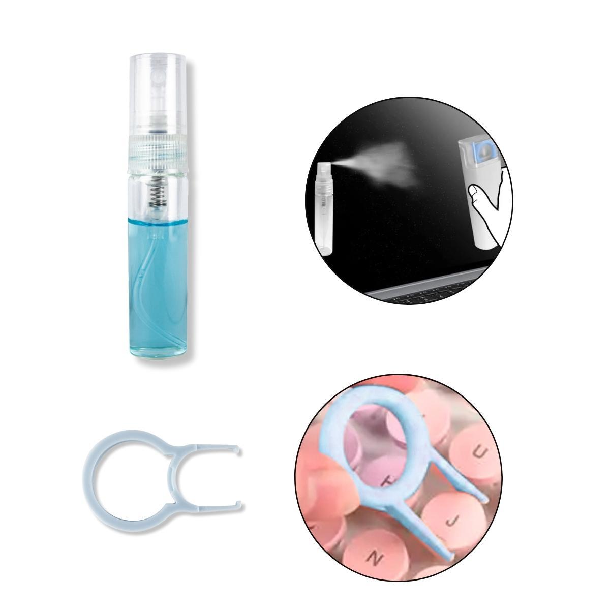Spray Com Líquido De Limpeza: Um Pequeno Frasco De Spray Recarregável Com Líquido De Limpeza. Utilizado Para Aplicar Uma Solução Limpa-tela Ou Desinfetante De Forma Precisa E Uniforme Em Dispositivos.