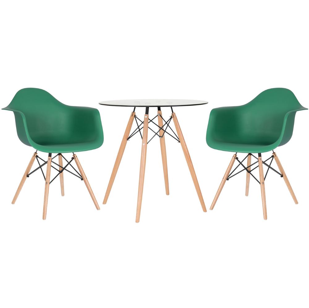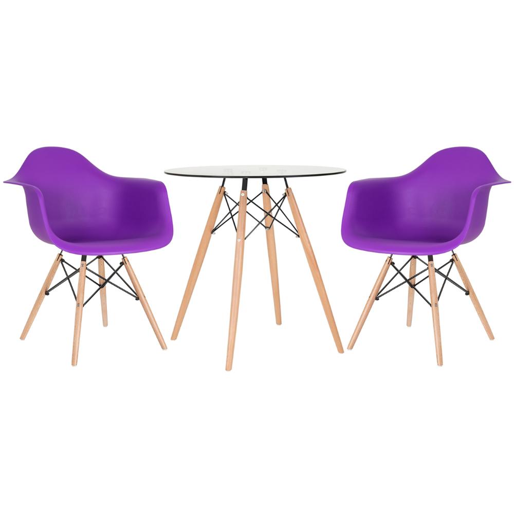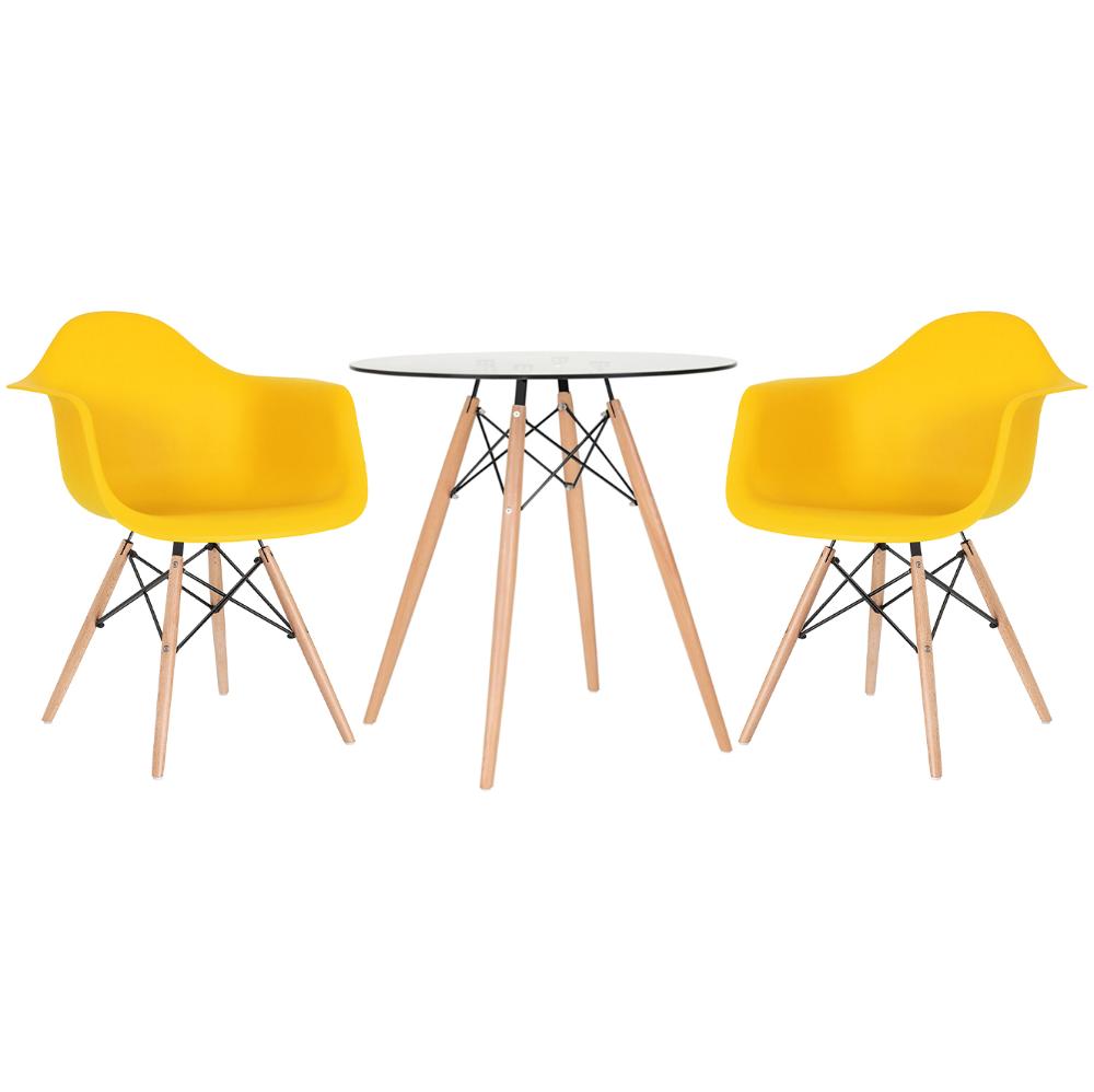 Cadeira Modelo Eames Daw: Material Do Assento: Polipropileno - Material Da Base: Madeira E Aço - Altura Do Encosto: 78 Cm - Altura Do Assento: 44 Cm - Altura Do Apoio De Braços: 65 Cm Largura Do Assento: 40 Cm - Profundidade Do Assento: 45 Cm - Distância Entre Os Pés: 45 Cm - Peso Suportado: 130 Kg - Mesa Redonda Eames Material Do Tampo: Vidro Incolor Temperado 8 Mm - Material Da Base: Madeira Natural E Aço - Diâmetro Do Tampo: 70 Cm - Altura: 75 Cm - Garantia: 3 Meses.