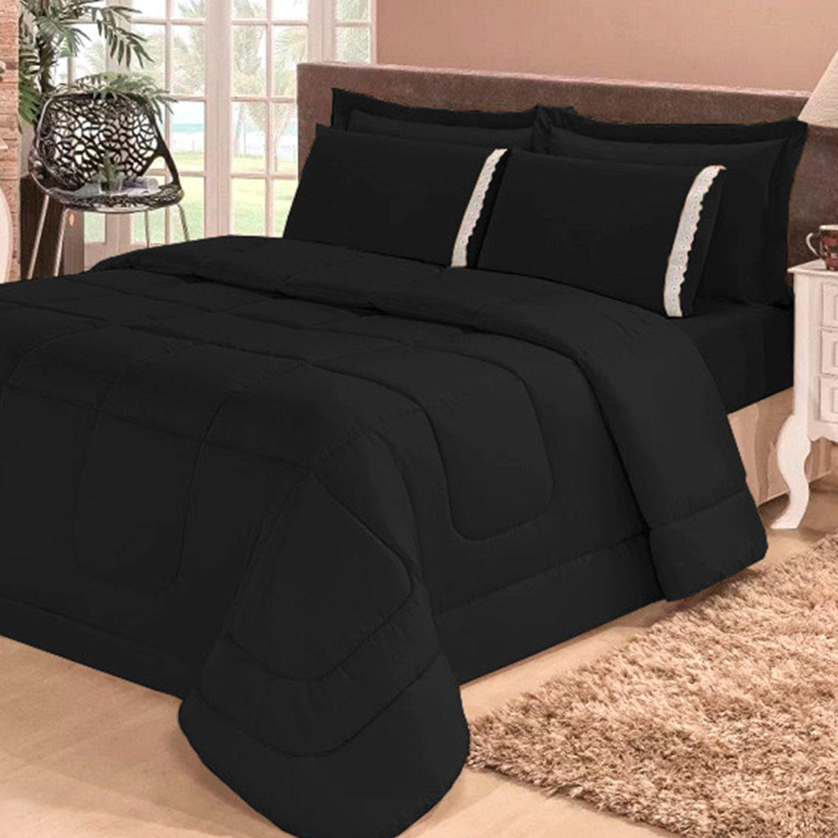 Kit 6 Pçs com Edredom e Lençol Aconchego Casa Dona Dupla Face Casal Queen Preto e Azul