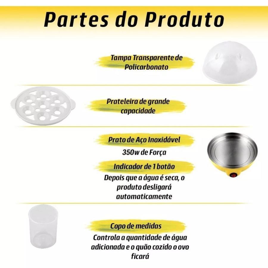 Máquina De Cozinhar Ovos E Legumes - Praticidade E Saúde 220v O Cozedor De Ovos A Vapor É Ideal Para Quem Mantém Uma Vida Corrida, E Não Abre Mão De Refeições Rápidas E Gostosas. Ele Permite Que Você Escolha E Programe O Ponto Dos Ovos, E Vai Variar De Acordo Com A Quantidade De Água Colocada No Reservatório, Ele É Um Produto Que Economiza Espaço E É Super Fácil De Usar E Lavar, E Além De Ovos Você Também Pode Utilizá-lo Para Cozinhar Legumes E Muito Mais. Descrição Cozinha Até 7 Ovos - Gema Mole, Macia Ou Dura Também Faz Salsicha, Legumes E Tudo A Vapor. Características Gerais: Design Sofisticado E Inovador, Basta Colocar Água E Ligar O Botão, Cozinha Até 7 Ovos Ao Mesmo Tempo, Permite Escolher O Ponto De Cozimento (mole, Macio Ou Bem Cozido), O Ovo Não Trepida E Não Racha, Ultra Performance, Com 350w De Potência, Tempo Médio De Preparo De 3 A 10 Minutos Conforme O Ponto, Automático, A Luz Apaga Quando O Cozimento Está Completo, Luz Indicadora De Funcionamento, Pode Ser Levado A Mesa, Excelente Para Fazer Ovos, Omeletes, Salsicha, Legumes, Entre Outros, Fácil De Lavar E Prático Para Guardar, Especificações: Voltagem 220v Potência: 350w Frequência: 60hz Dimensão (l X A X P): 15,0 X 15,0 X 15,0cm Peso: 550 G Itens Inclusos: Cozedor, E Copo Dosador Manual Do Usuário Instruções De Uso: Coloque No Copo Medidor A Quantidade De Água Para Atingir O Ponto Do Ovo Que Deseja. Despeje A Água Na Base De Cozimento E Coloque O Suporte Para Ovos. Coloque Os Ovos. Ligue O Aparelho E Coloque A Tampa (nunca Cubra A Tampa Com Qualquer Pano Ou Objeto). A Luz Do Botão Liga/desliga Apaga Ao Finalizar O Cozimento. Escolhendo O Ponto (use O Copinho Medidor Que Acompanha O Produto): Ovo Com Gema Mole: 30ml De Água - Metade Do Copinho Ovo Com Gema Macia: 40ml De Água - 3/4 Do Copinho Ovo Com Gema Dura: 60ml De Água - Copinho Cheio
