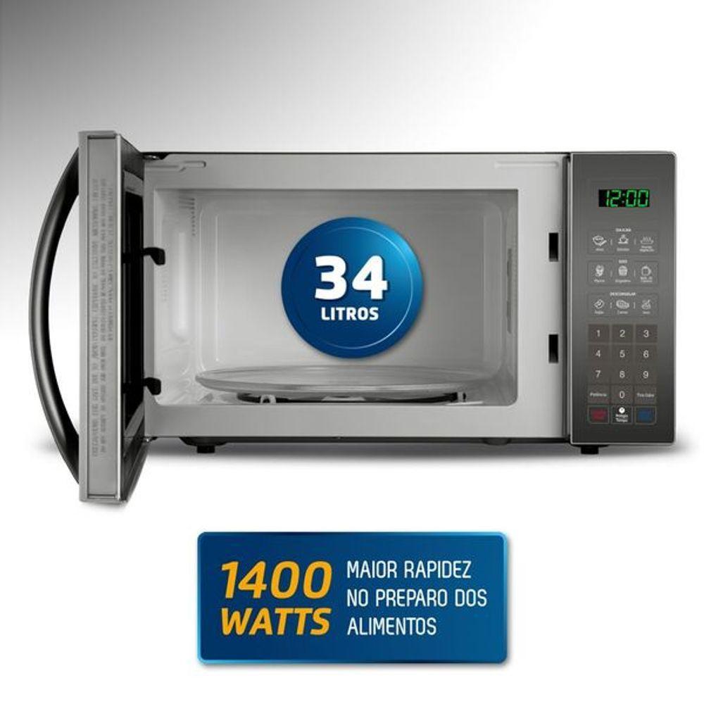 Micro-ondas com espaço interno de 34 litros, suficiente para atender toda a família. A alta potência de 1400w proporciona mais rapidez nos preparos e descongelamentos.
