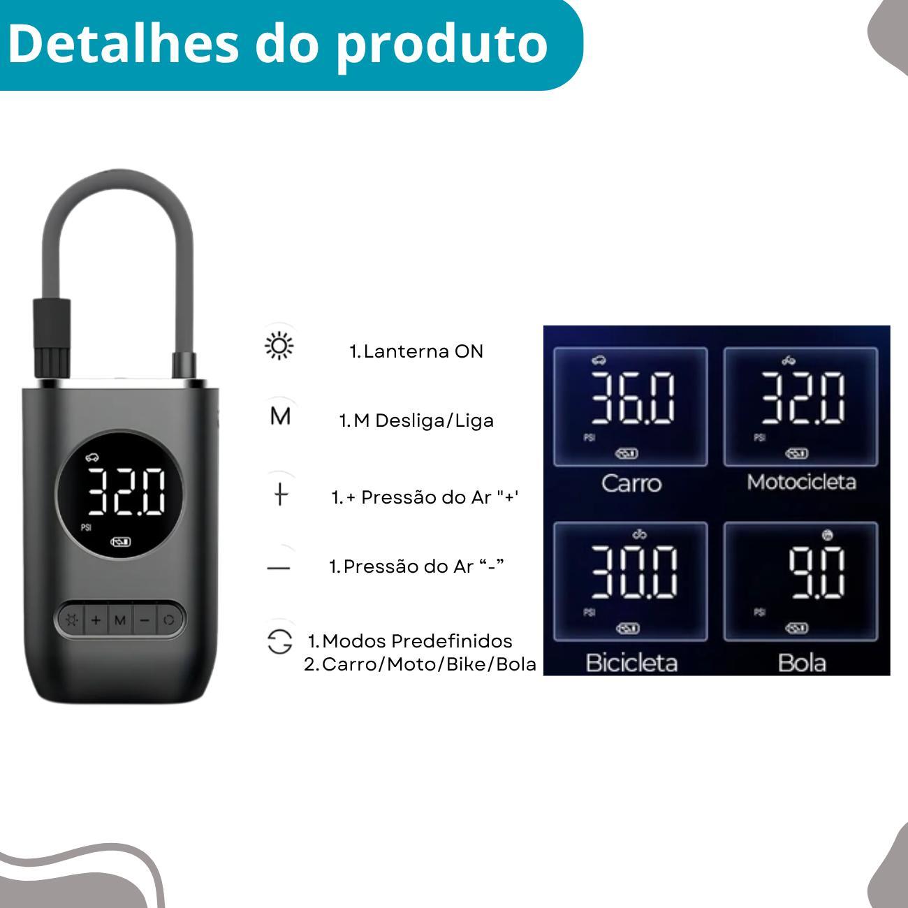 Tenha Sempre À Mão O Compressor De Ar Portátil Digital, Indispensável Para Inflar Pneus De Carros, Motos, Bicicletas, E Até Bolas. Compacto E Potente, Com Função Recarregável E Lanterna Integrada Para Emergências.