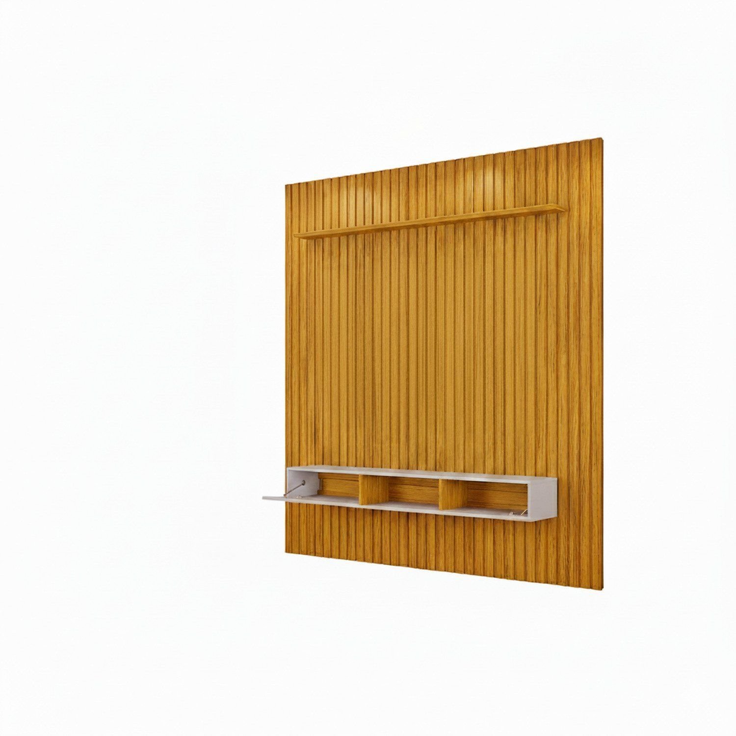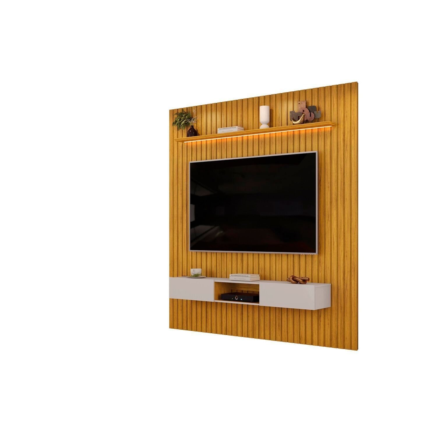 Além disso, o Painel Ripado Trento conta com uma ampla prateleira de 25cm de espessura e com borda chanfrada, onde você pode manter objetos decorativos em posição de destaque. O produto conta com iluminação LED horizontal na prateleira, equipado com lente difusora que proporciona uma iluminação suave e acolhedora.