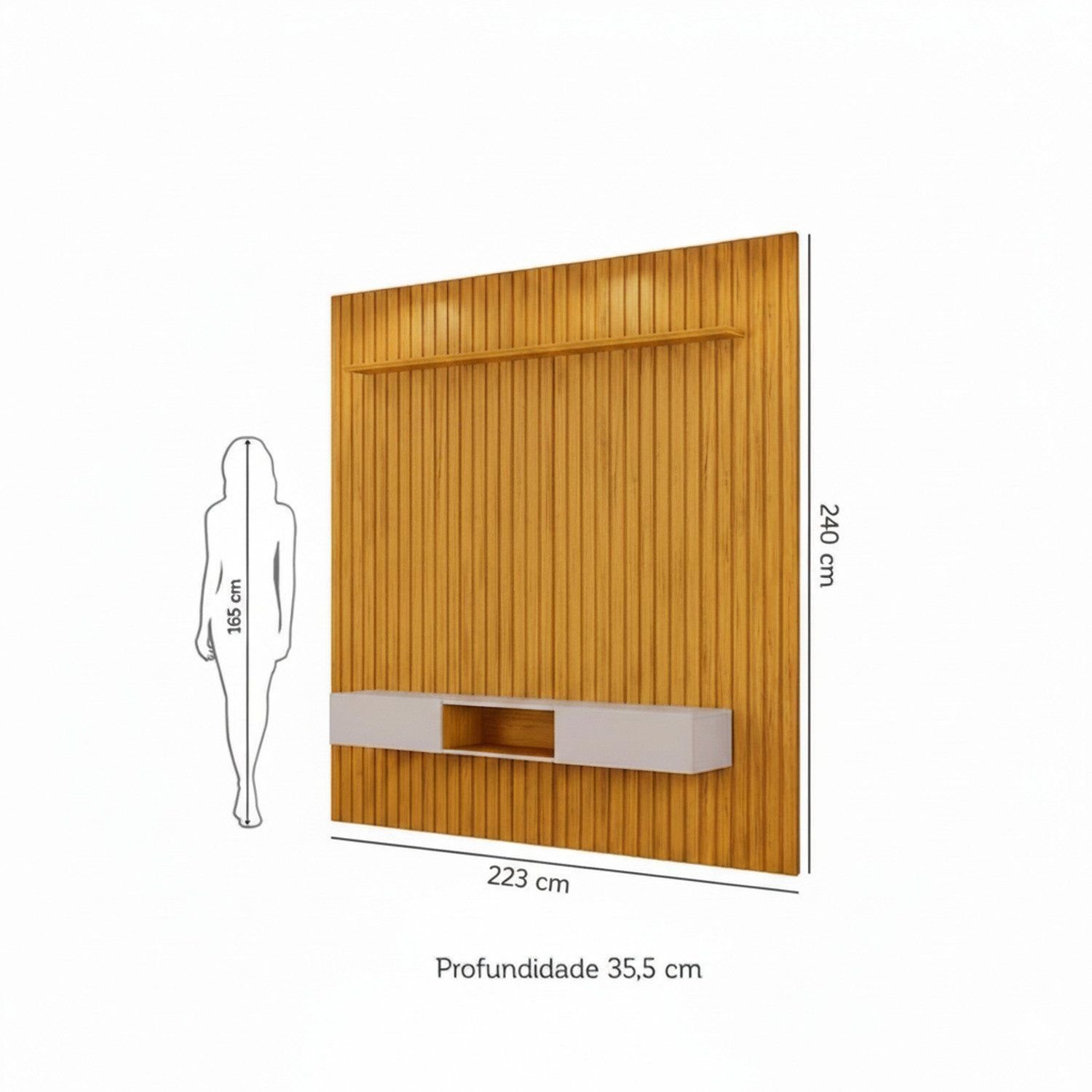 Toda sua extensão é composta de peças ripadas de MDF de 15cm , que são chapas de madeira reconstituída advindas de reflorestamento, matéria prima que não prejudica o ambiente e garante durabilidade e resistência ao seu produto.