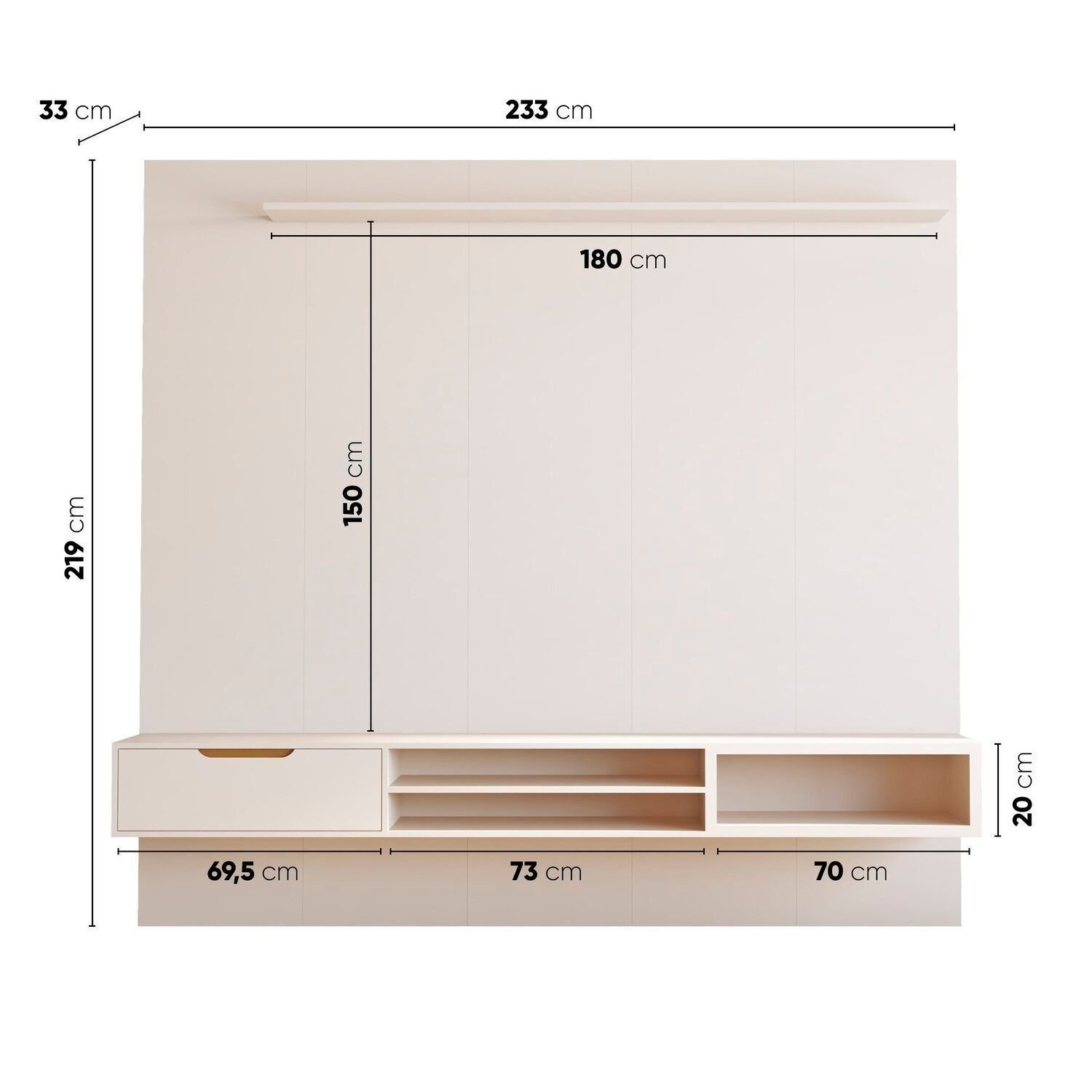 Estilo: Moderno | Peso (kg): 101.5 | Garantia: 08 Meses | Altura (cm): 219 | Acabamento: Pintura Uv | Largura (cm): 233 | Possui Pés: Suspenso | Possui Vidro: Não | Possui Nichos: 3 | Possui Portas: Não | Possui Gavetas: Não | Possui Tomadas: Não | Suporta Até (kg): 49 | Possui Espelhos: Não | Profundidade (cm): 33 | Escala De Brilho: Semi-brilho | Gaveta Com Chave: Não | Serviço Montagem: 114259443 | Cor Da Prateleira: Bege | Fixação Na Parede: Sim | Origem Do Produto: Nacional | Possui Iluminação: Não | Ambiente Principal: Sala De Estar | Material Da Gaveta: Mdf | Material Principal: Mdf | Possui Passa Cabos: Sim | Possui Prateleiras: Sim | Espessura Do Painel: 1.5 | Sapatas Niveladoras: Não | Acabamento Da Gaveta: Pintura Uv | Material Da Prateleira: Mdf | Peso Máximo Por Gaveta: 2 | Acabamento Da Prateleira: Pintura Uv | Tipo De Puxador Da Gaveta: Embutido | Escala De Brilho Da Gaveta: Semi-brilho | Peso Máximo Por Prateleira: 2 | Tipo De Corrediça Da Gaveta: Metálica Telescópica | Ideal Para Tvs Até (polegadas): 84 | Escala De Brilho Da Prateleira: Semi-brilho | Suporte De Tv Universal Incluso: Não | Fabricante: Jb Bechara | Marca: Jb Bechara | Cor Flex: Não | Cor Interna: Off White | Cor: Off White | Cor Do Produto: Off White | Itens Inclusos: 1 Painel, Kit Ferragens E Manual De Montagem. | Cor Predominante: Bege | Linha Ou Coleção: Plus | Quantidade De Prateleiras: 01 Prateleira | Quantidade De Gavetas: 01 Gaveta