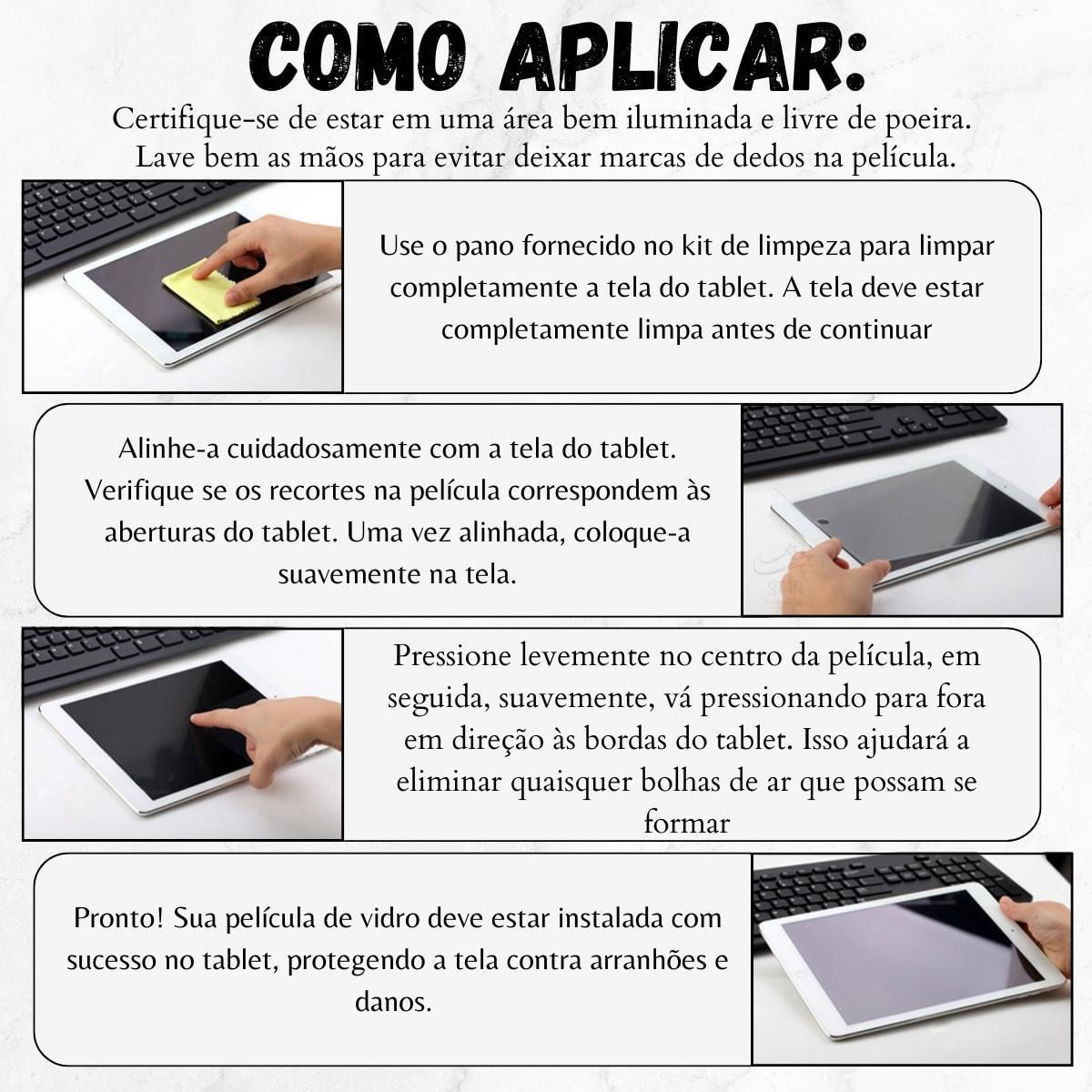 1- A Instalação É Super Fácil, Basta Alinhar A Película Com A Tela Do Tablet, Que Deverá Ser Previamente Limpa, Enviaremos Um Kit De Limpeza, E Dar Uma Pequena Pressão No Centro Da Película Para Que A Adesão Seja Completa E Sem Bolhas.