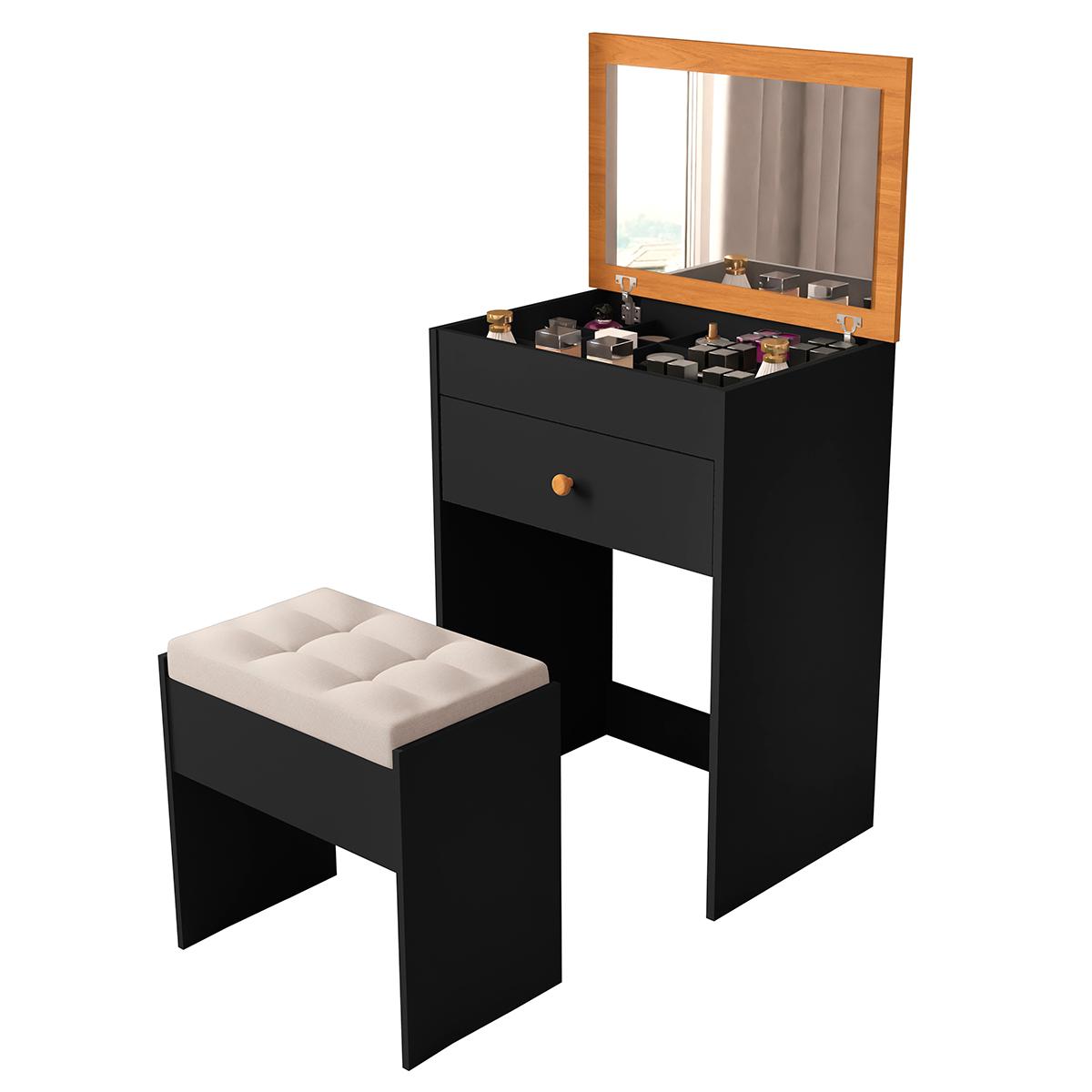 A Penteadeira Clara É O Toque De Charme E Praticidade Que O Seu Quarto Precisa! Compacta E Funcional, Ela Conta Com Espelho Amplo, Gaveta Com Corrediça Telescópica E Porta Basculante Com Divisória, Perfeitas Para Organizar Maquiagens E Acessórios. Acompanha Banqueta Confortável Com Estofado Em Suede, Unindo Beleza E Conforto. Feita Em MDF De 15 Mm , Oferece Resistência E Elegância Em Cada Detalhe. Ideal Para Deixar Sua Rotina Mais Prática E Estilosa!