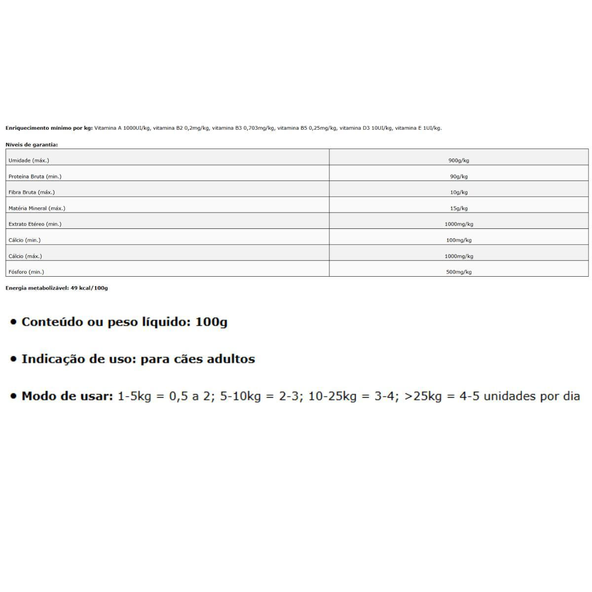 Carne De Frango 84,2%, Cenoura 4%, Batata 4%, Amido De Mandioca 4%, Carragena 3%, Sal 1%, Extrato De Chá Verde 0,02%, Vitaminas (a, B2, B3, B5, D3, E).
