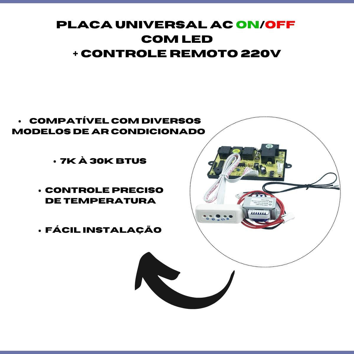 Atenção: Não É Compatível Com Ar Condicionado Inverter E Piso Teto Kit: - Placa Universal On/off Com Led Ar Condicionado Split, - Controle Remoto, - Transformador, - Sensor Temperatura, - Kit Plug. Aplicado: Ar Condicionado Split Hi Wall, Atende: 7mil À 30mil Btus.