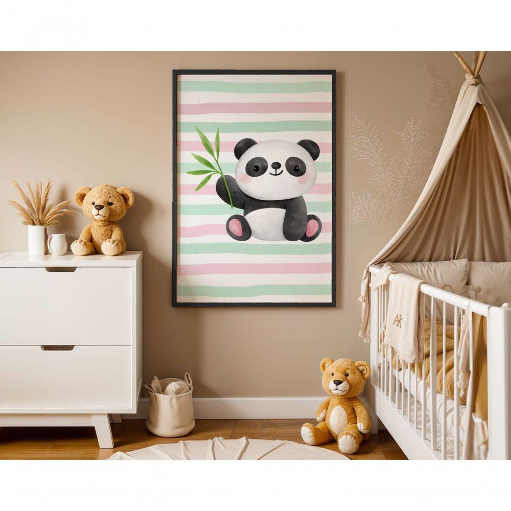 Quadro Infantil Panda Feliz Retangular 20x30 em Vinil com ou sem Vidro para Decoração de Quarto Branco