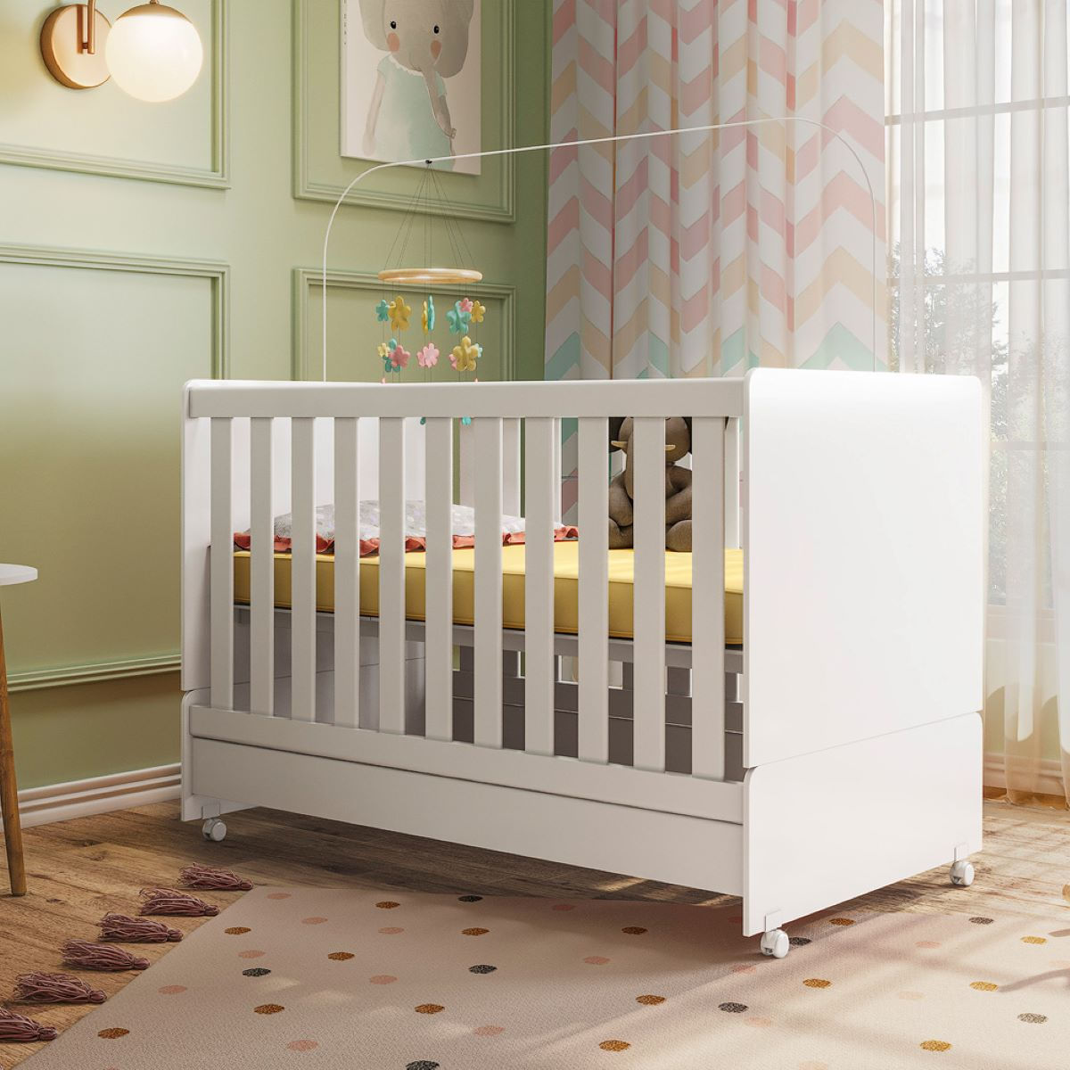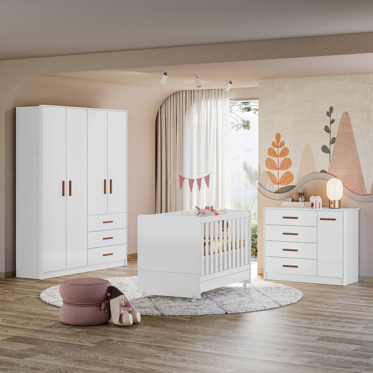 Quarto Infantil Pérola Com Berço Encanto, Cômoda E Guarda Roupa Cor Branco - Peternella Garanta O Melhor Para O Quarto Do Seu Bebê Com Nosso Quarto Infantil Perola, Composto Por Berço Vira Mini Cama, Cômoda E Guarda-roupa. O Berço É Certificado Pelo Inmetro, Com Grades Fixas De Mdf, Rodízios Com Trava E Suporte Para Mosqueteiro. A Cômoda E O Guarda-roupa Oferecem Ampla Capacidade Com Gavetas E Portas, Trazendo Praticidade E Estilo Ao Ambiente. Aproveite E Leve Já! Diferenciais: - Cor: Branco - 5 Portas - 7 Gavetas Com Corrediças Telescópicas - Berço Transformável Em Mini Cama - Berço Testado E Certificado Pelo Inmetro (registro 0033/001368-2020) - Suporte Para Mosqueteiro - Berço Com Quatro Rodízios, Sendo 2 Com Trava - Grades Fixas De Mdf Para Maior Segurança - Padrão Americano De Berço, Compatível Com Colchão De 70x130 Cm (colchão Vendido Separadamente) - Prateleiras Internas - Puxadores Em Mdf Revestido - Produzido Em Mdp Bio-sustentável De 15mm E 12mm - Pintura Uv - Amplo Espaço Interno - Acompanha Kit De Acessórios E Esquema De Montagem Dimensões Do Guarda Roupa Montado: - Altura: 220 Cm - Largura: 176 Cm - Profundidade: 47 Cm Dimensões Do Berço Encanto Montado: - Altura: 91,60 Cm - Largura: 132,60 Cm - Profundidade: 77 Cm