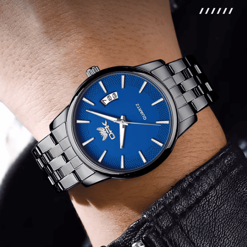 - Mostrador Azul Vibrante: O mostrador azul profundo, com textura refinada, oferece um contraste visual impactante contra os índices e ponteiros polidos.