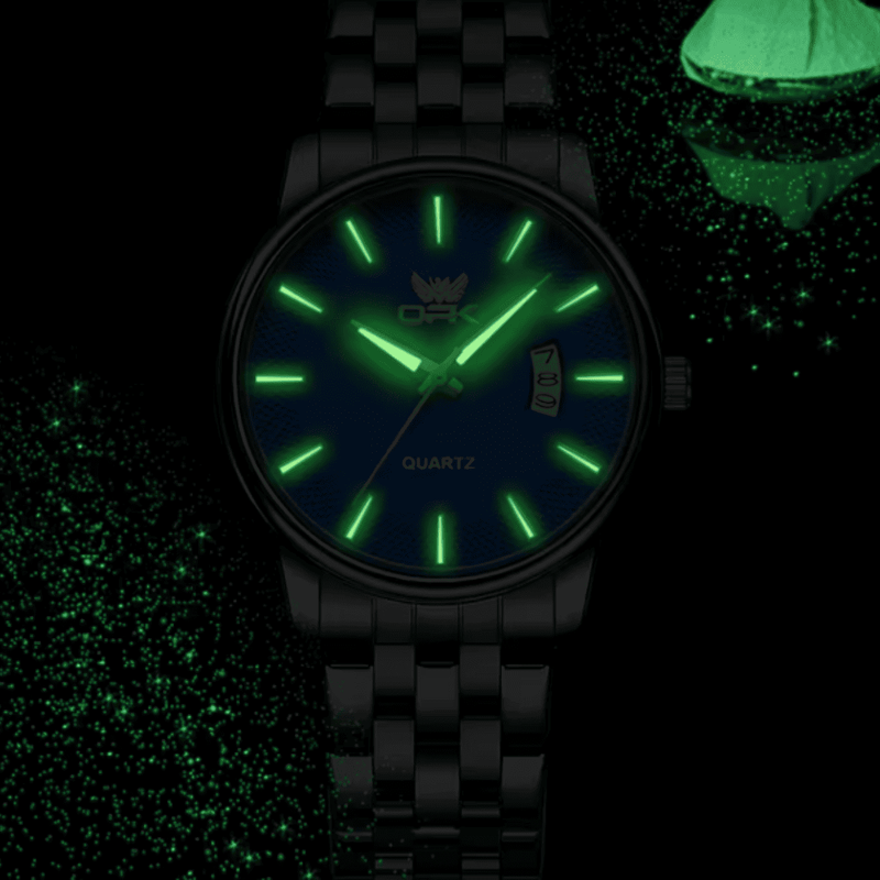 - Visibilidade Noturna Superior: Os ponteiros e índices são revestidos com material luminescente, permitindo uma leitura clara e imediata da hora mesmo em ambientes de pouca ou nenhuma luz.