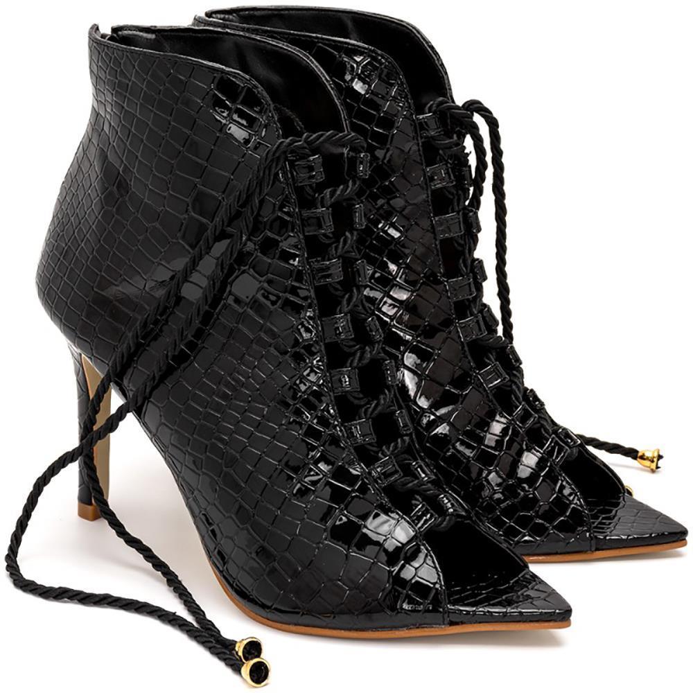 Sandália Feminina Ankle Boot Croco Salto Fino Alto Conforto Preto 35