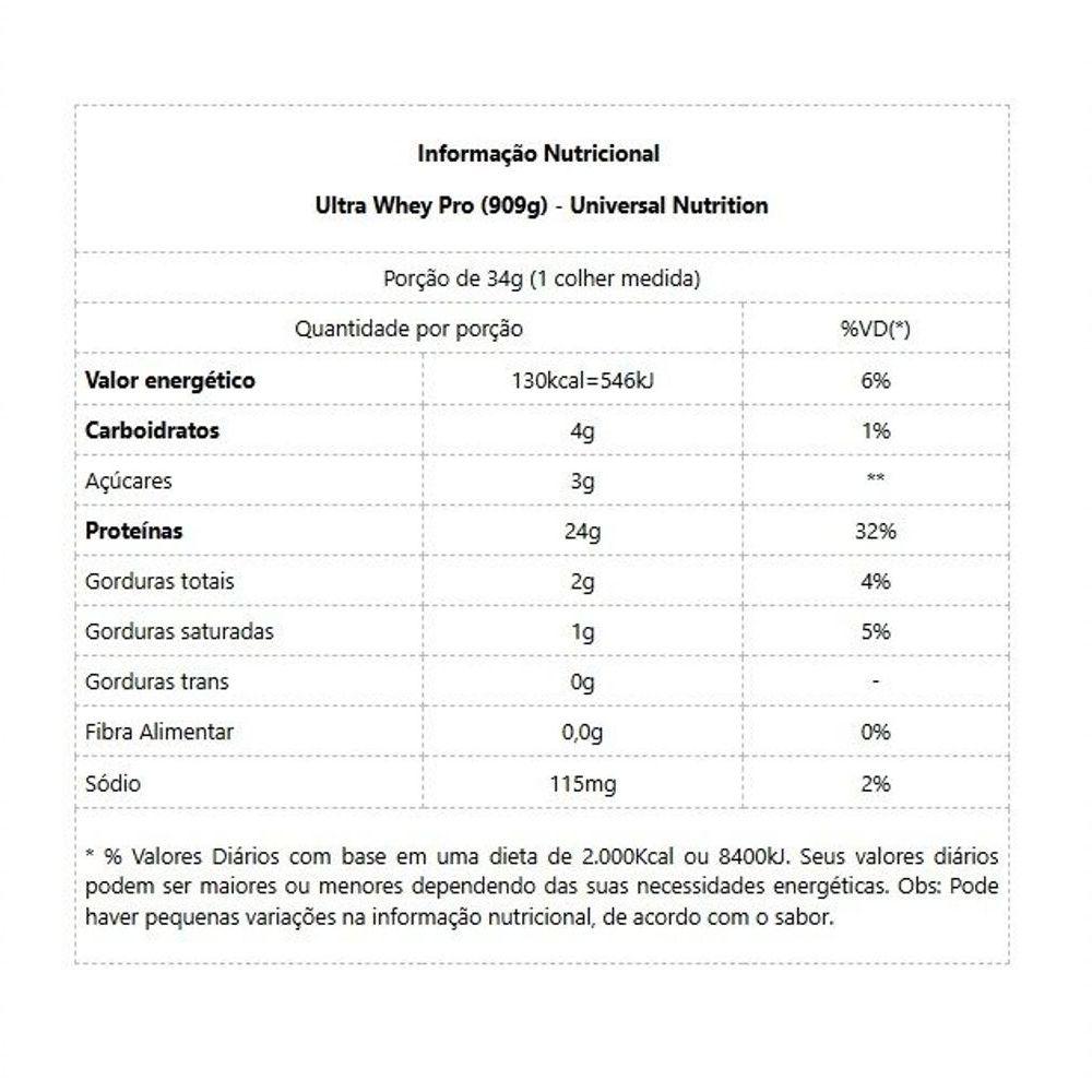 Ultra Whey Pro (909g) - Sabor: Sorvete De Morangoultra Whey Pro - Universal Nutrition Ultra Whey Pro Da Universal É Um Suplemento Alimentar Que Utiliza Moderna Tecnologia De Micro E Ultrafiltração, Tornando-se O Concentrado De Proteína Do Soro De Leite Da Mais Alta E Pura Qualidade. As Proteínas Tem Um Papel Importante No Crescimento E Reparação De Tecidos Do Corpo E Formação De Enzimas E Hormônios. Além De Ajudarem Na Formação De Anticorpos Que Permitem O Corpo Combater Infecções. O Uso Da Proteína No Exercício Físico É Recomendado Para Que Não Ocorra A Quebra Ou Rompimento Do Tecido Muscular. Ultra Whey Pro Tem Um Alto Padrão De Qualidade Quando Nos Referimos A Whey Protein, Seja Para Auxiliar No Treinamento Para Ganhar Massa Ou No Treinamento Para Perder Gordura. Este Suplemento Alimentar É Uma Excelente Fonte De Whey Protein, Pois, Cada Dose Fornece 24 Gramas De Proteínas Da Fórmula Exclusiva Pure Whey Protein Blend, Uma Matriz Única De Whey Isolado, Peptídeos Do Soro Do Leite Parcialmente Hidrolisados De Whey Concentrado. Ultra Whey Pro É Processado E Ultrafiltrado Nas Mais Baixas Temperaturas Para Garantir Que Você Retenha Por Mais Tempo E Aproveite O Máximo De Suas Funções Nutricionais. Este Suplemento Alimentar É Também Uma Excelente Fonte De Aminoácidos Da Cadeia Ramificada (leucina, Isoleucina E Valina). Ultra Whey Pro Tem Um Baixo Teor De Carboidratos E Gorduras. A Fórmula Deste Suplemento É Muito Saborosa, Além De Ser Uma Excelente Fonte De Proteínas Para Suprir Suas Necessidades Diárias. Benefícios:* 24 Gramas De Proteínas, Por Porção,* 4,5 Gramas De Bcaae#039,s,* Baixa Concentração De Carboidratos,* Aumento Da Massa Muscular,* Acelera A Definição Das Fibras Musculares,* Ajuda No Processo De Emagrecimento,* Diminui A Inflamação Muscular.informação Nutricional Ultra Whey Pro (909g) - Universal Nutritionporção De 34g (1 Colher Medida)quantidade Por Porção%vd(*)valor Energético130kcal=546kj6%carboidratos4g1%açúcares3g**proteínas24g32%gorduras Totais2g4%gorduras Saturadas1g5%gorduras Trans0g-fibra Alimentar0,0g0%sódio115mg2%* % Valores Diários Com Base Em Uma Dieta De 2.000kcal Ou 8400kj. Seus Valores Diários Podem Ser Maiores Ou Menores Dependendo Das Suas Necessidades Energéticas. Obs: Pode Haver Pequenas Variações Na Informação Nutricional, De Acordo Com O Sabor.