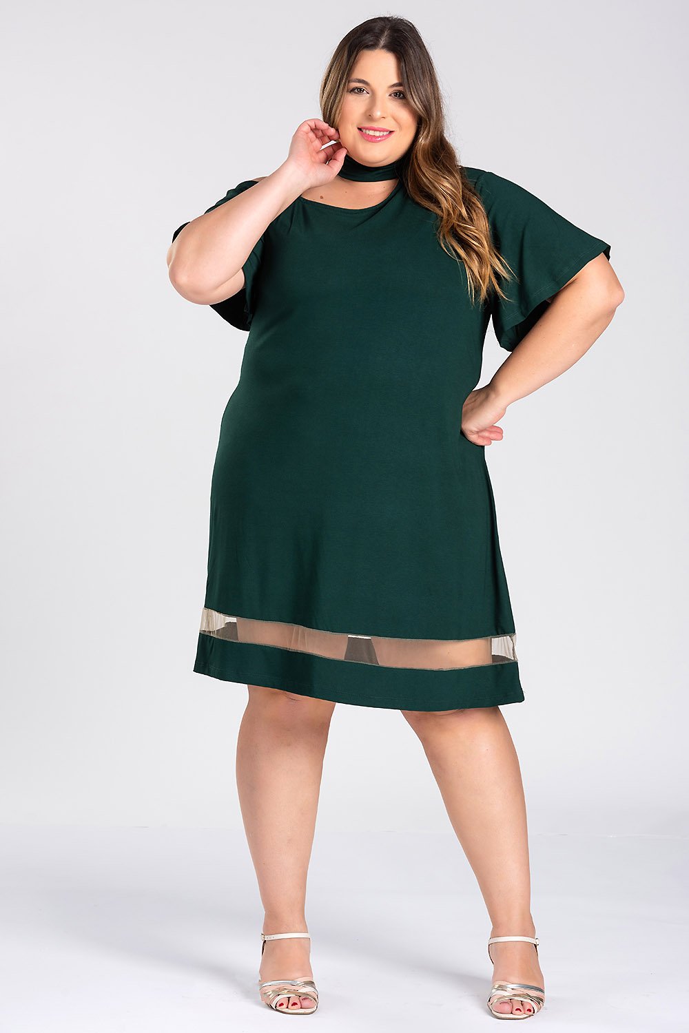 Vestido Plus Size Malha Viscose Detalhe Decote, Corrente Alça E Barra Em Tule - Serena