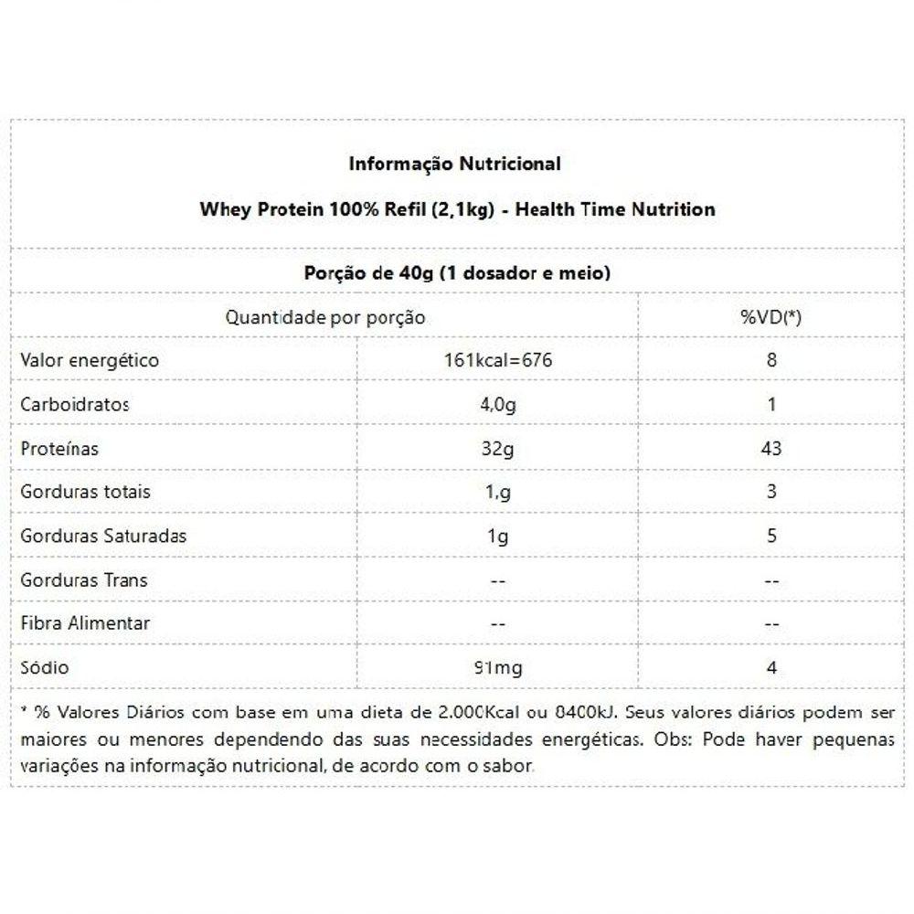 Whey Protein 100% Refil (2,1kg) - Sabor: Baunilhawhey Protein 100% Refil (2,1kg) O Whey 100% Contém Três Tipos De Proteínas Do Soro Do Leite: Concentrada (wpc), Isolada (wpi) E Hidrolisada (wph), Matérias-primas Com Alta Concentração De Aminoácidos, Principalmente Bcaa. Essas Características Dessa Fórmula Torna Um Produto Extraordinário Que Auxilia Na Formação Dos Músculos E Na Recuperação Muscular Pós-treino. Contendo Altas Quantidade De Aminoácidos Essenciais (bcaa). Benefícios: - 32g De Proteínas, Por Porção,- 5g De Glutamina, Por Porção,- 6g Bcaa, Por Porção,- Promove Um Alto Índice De Crescimento Muscular,- Fortalece O Sistema Imunológico,- Reduz Sintomas De Overtraining,- Mais Agilidade Para A Hipertrofia.informação Nutricional Whey Protein 100% Refil (2,1kg) - Health Time Nutritionporção De 40g (1 Dosador E Meio)quantidade Por Porção%vd(*)valor Energético161kcal=6768carboidratos4,0g1proteínas32g43gorduras Totais1,g3gorduras Saturadas1g5gorduras Trans----fibra Alimentar----sódio91mg4* % Valores Diários Com Base Em Uma Dieta De 2.000kcal Ou 8400kj. Seus Valores Diários Podem Ser Maiores Ou Menores Dependendo Das Suas Necessidades Energéticas. Obs: Pode Haver Pequenas Variações Na Informação Nutricional, De Acordo Com O Sabor. Aminograma Alanina1425mgarginina732mgác. Aspártico3827mgcisteína630mgglutamina6103mgglicina570mghistidina453mgisoleucina1790mgleucina2905mglisina2284mgmetionina588mgfenilalanina768mgprolina1418mgserina1148mgtreonina1987mgtriptofnano483mgtirosina648mgvalina1378mg